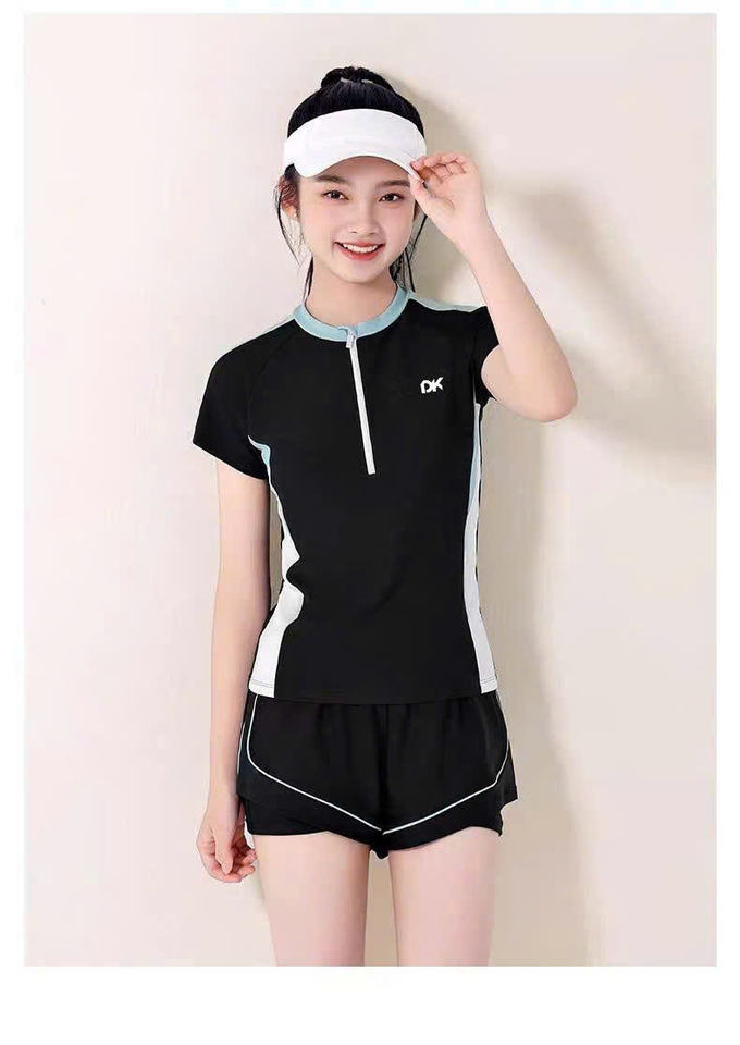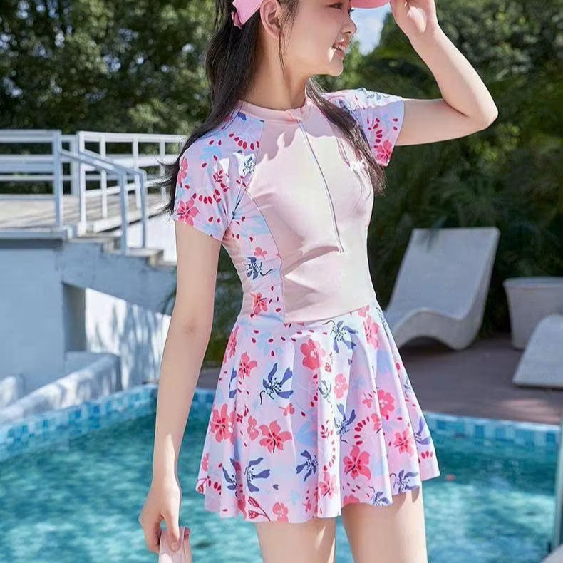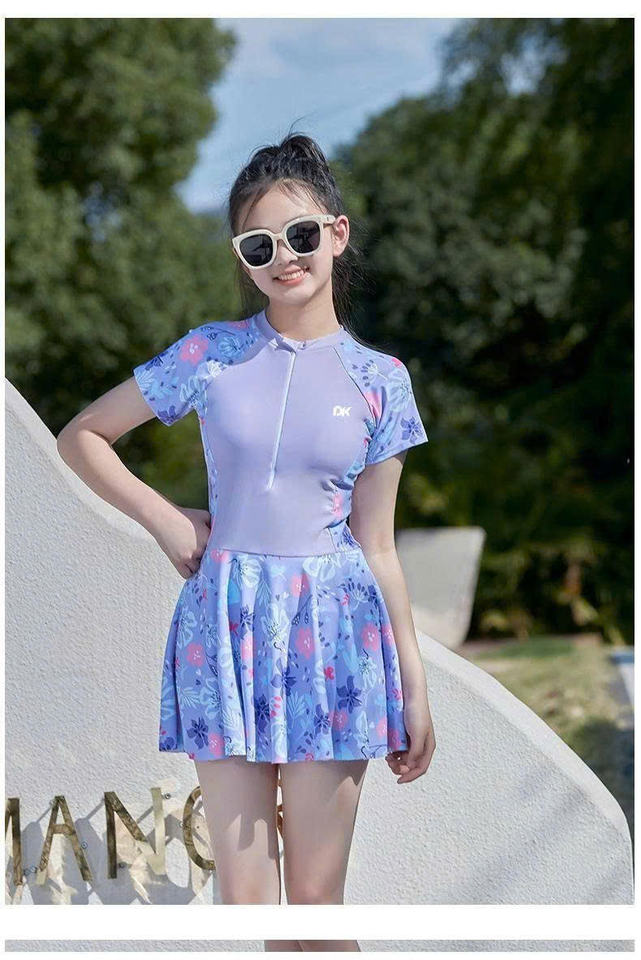 ชุดว่ายน้ำผู้หญิงคุณภาพสูง ทรงปกติ 2 ชิ้น ผ้าสแปนเด็กซ์/ไนลอน สีพื้น ป้องกันรังสียูวี กันน้ำ แห้งเร็ว ยืดได้ 4 ทิศทาง กระโปรงด้านหน้า
