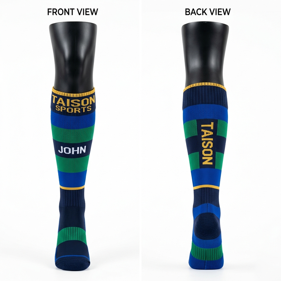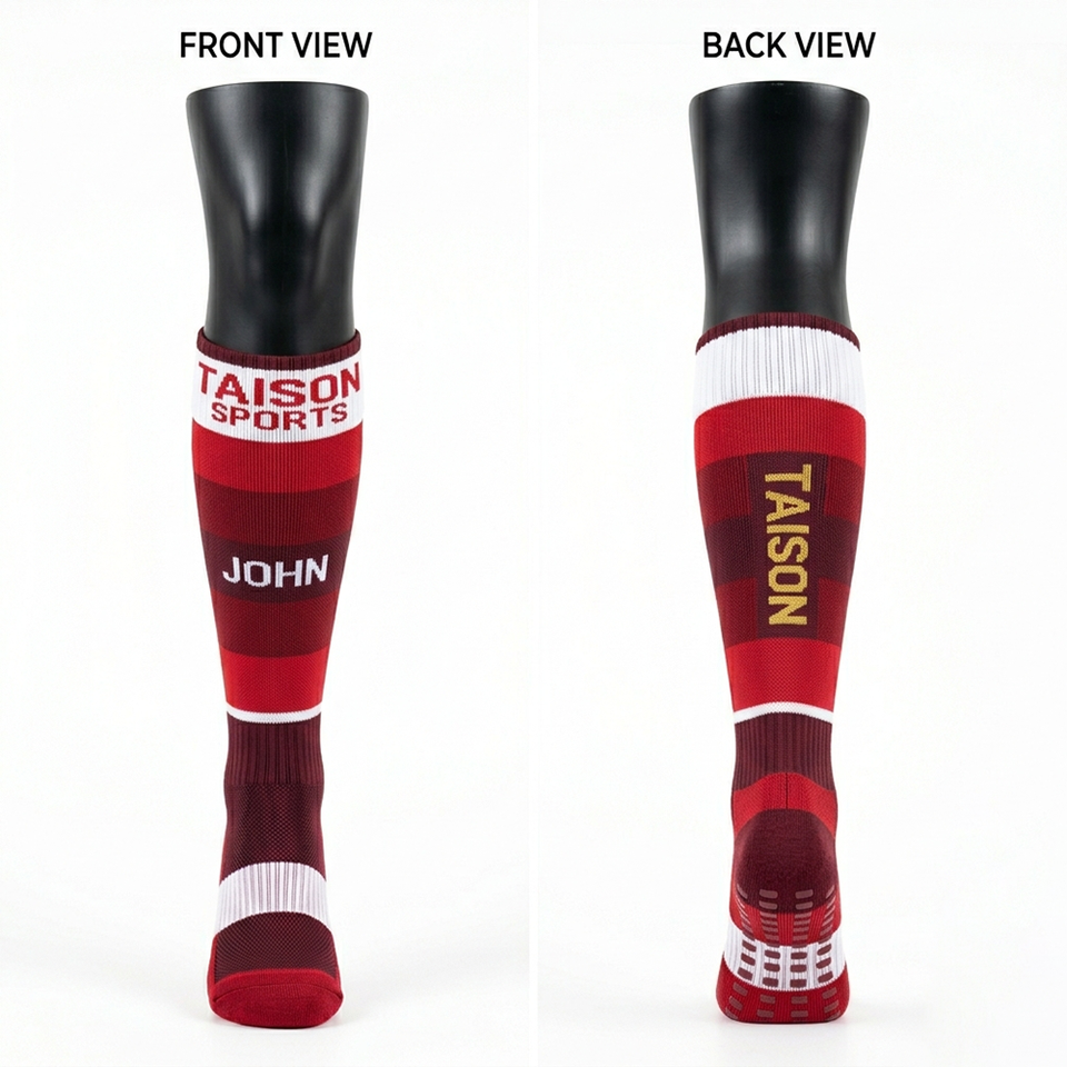 ถุงเท้ารักบี้ผู้หญิงคุณภาพสูง ผ้าฝ้ายผสมโพลีเอสเตอร์และสแปนเด็กซ์ สีแดงกรมท่า ลายแถบ พร้อมพื้นรองรับแรงกระแทกและกันลื่น โลโก้ถักแบบกำหนดเอง