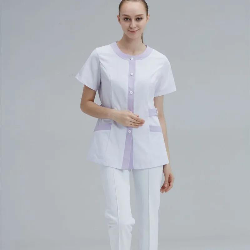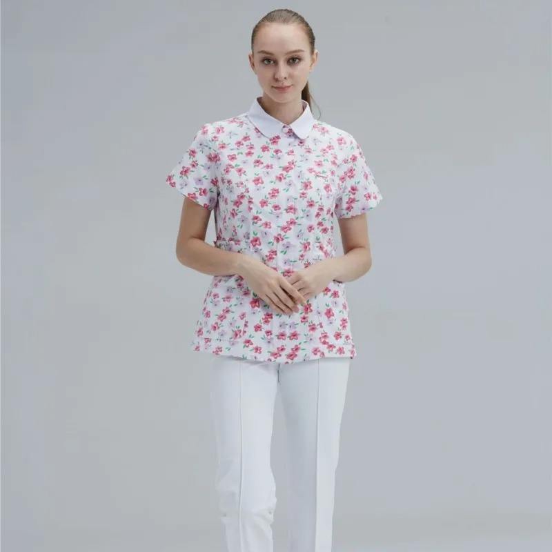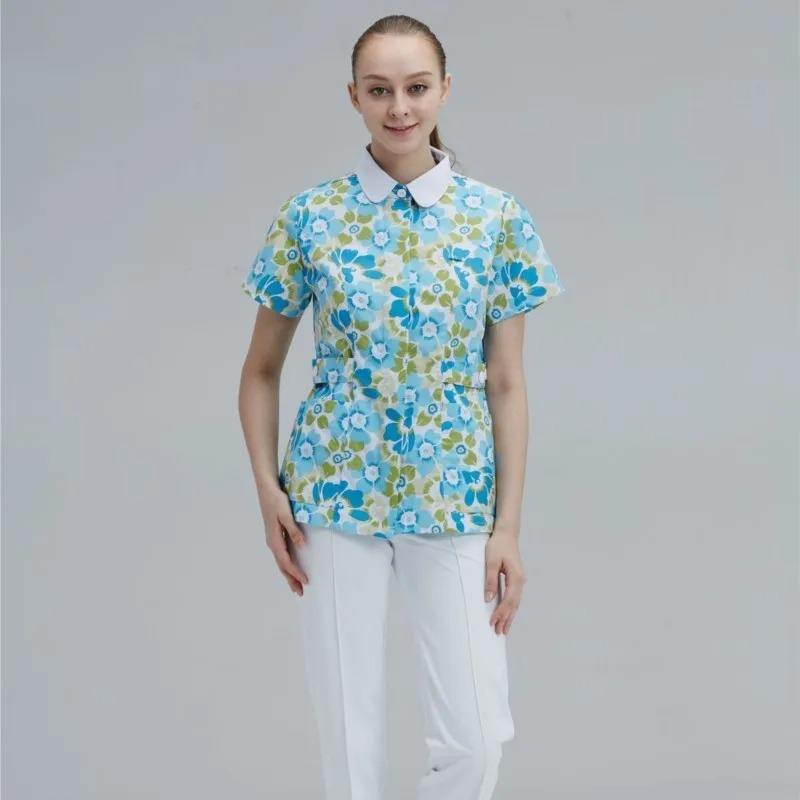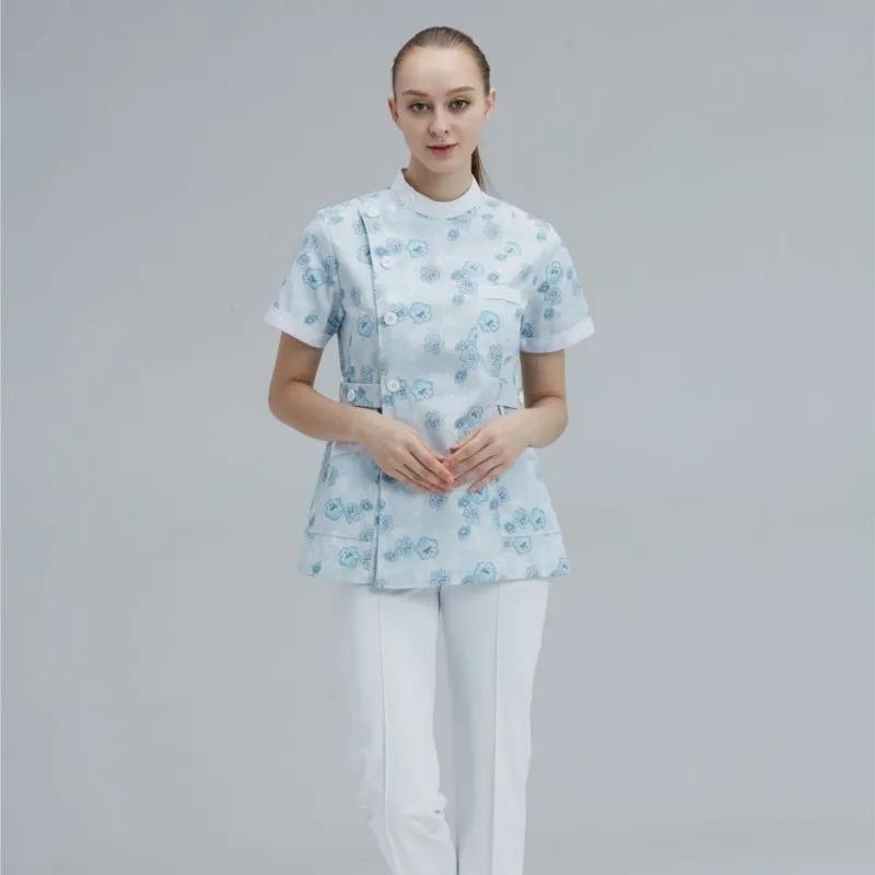 ชุดสครับผ้าสแปนเด็กซ์สำหรับผู้หญิงชุดเครื่องแบบพยาบาลโรงพยาบาลพิมพ์ลายยี่ห้อส่วนตัว