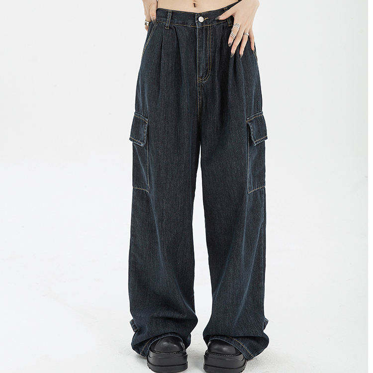 กางเกงยีนส์ขาตรงสำหรับผู้หญิงกางเกงขากว้างแบบลำลองพร้อมกางเกงทรงหลวมดีไซน์ทุกข์