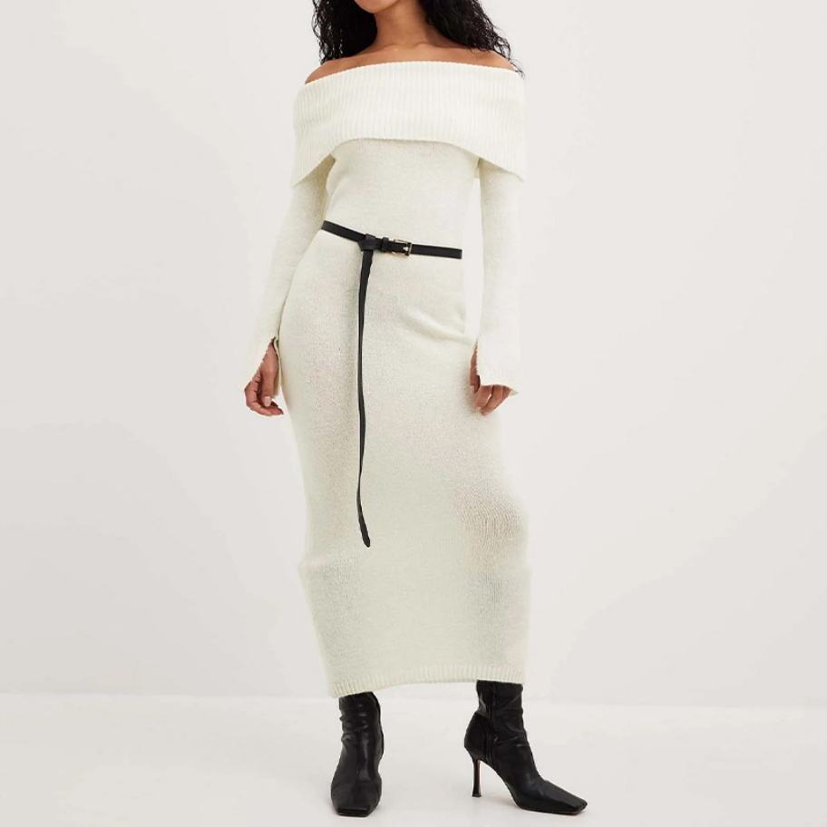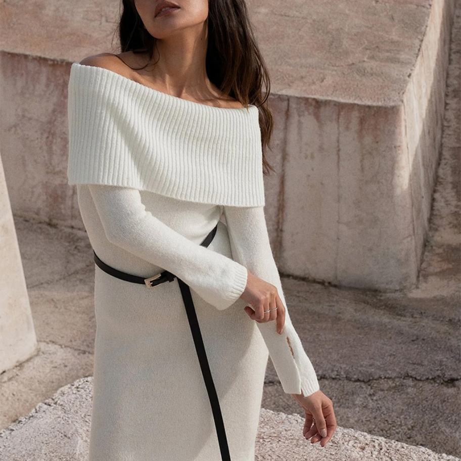 เดรสยาวไหมพรมแขนยาวสำหรับผู้หญิงคุณภาพสูง สีขาว ทรงเข้ารูป เหมาะสำหรับฤดูหนาว