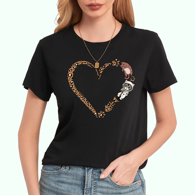 เสื้อยืดผู้หญิงคุณภาพสูง ทรงหลวม ผ้าฝ้าย/โพลีเอสเตอร์ ลายเสือดาว พิมพ์ลายหัวใจ ระบายอากาศได้ดี เสื้อยืดลำลองสำหรับผู้หญิง