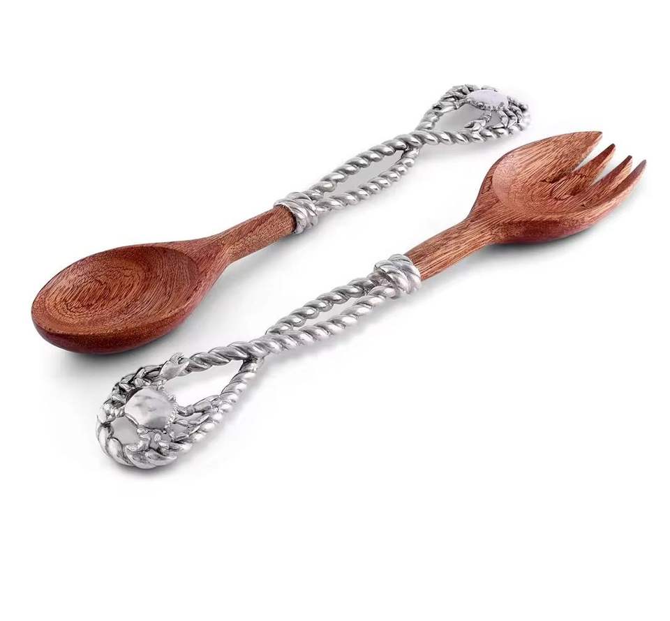 ช้อนตักสลัดไม้อาเคเซียทำด้วยมือด้ามจับแบบโบราณเคลือบเงินใช้กับเตาอบไมโครเวฟได้อย่างปลอดภัยดีไซน์หรูหรา
