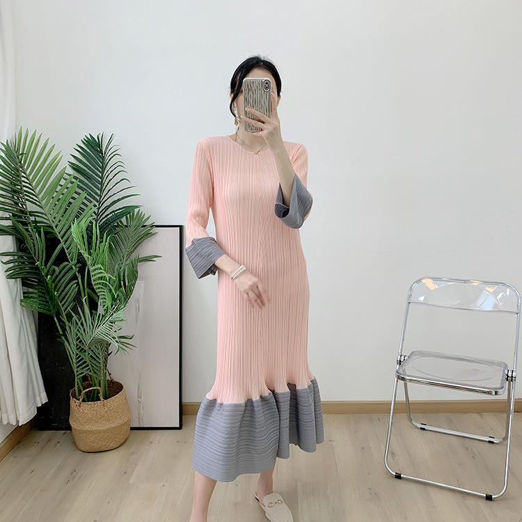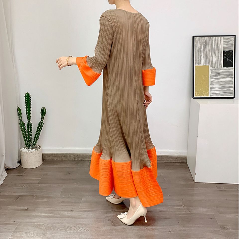 เดรสมิดิผ้าทอจีบสีตัดกันสำหรับผู้หญิงเสื้อผ้าสตรีขนาดพลัสไซส์สไตล์ลำลอง