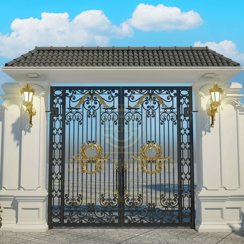 ประตูรั้วเหล็กดัดคุณภาพสูง แบบเปิดคู่ ดีไซน์สั่งทำพิเศษ ตีขึ้นรูปด้วยมือ ชุบกัลวาไนซ์ ป้องกันการโจรกรรม หลายสี สำหรับทางเข้า