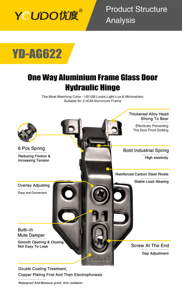 บานพับไฮดรอลิกคุณภาพสูง YOUDO แบบยึดติด โครงอะลูมิเนียม อุปกรณ์ฮาร์ดแวร์เฟอร์นิเจอร์สำหรับตู้ห้องนอนและประตู วัสดุโลหะผสมสังกะสี