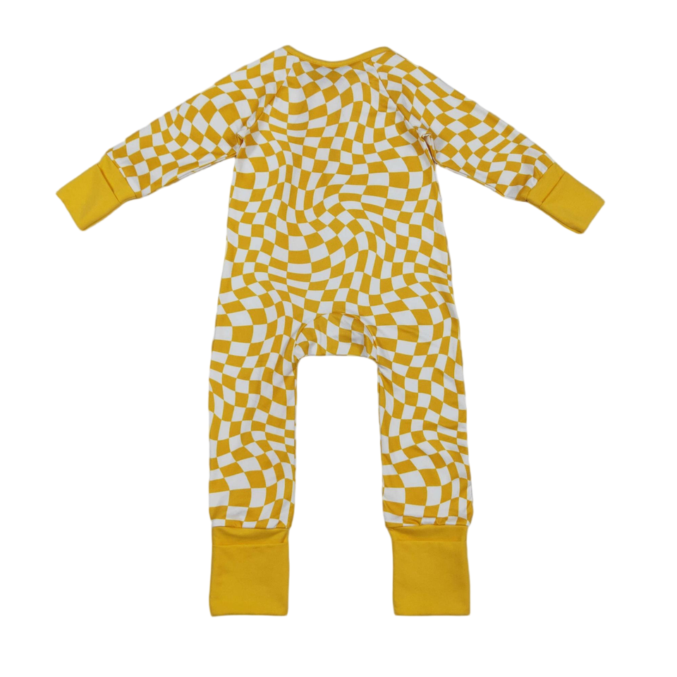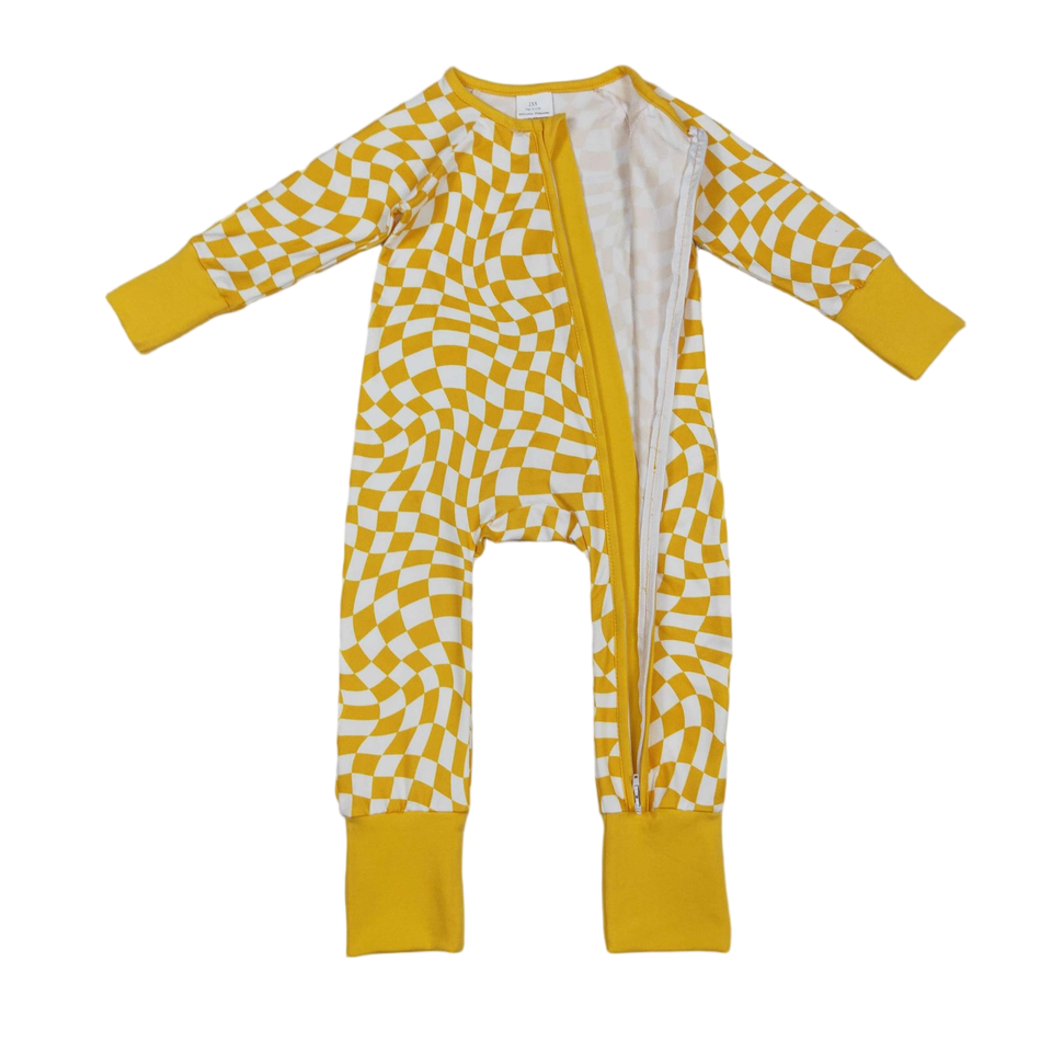 ชุดหมีแขนยาวลายตารางหมากรุกสีเหลืองมีซิปสำหรับเด็กผู้หญิงเสื้อผ้าบูติกปลายแฟชั่น