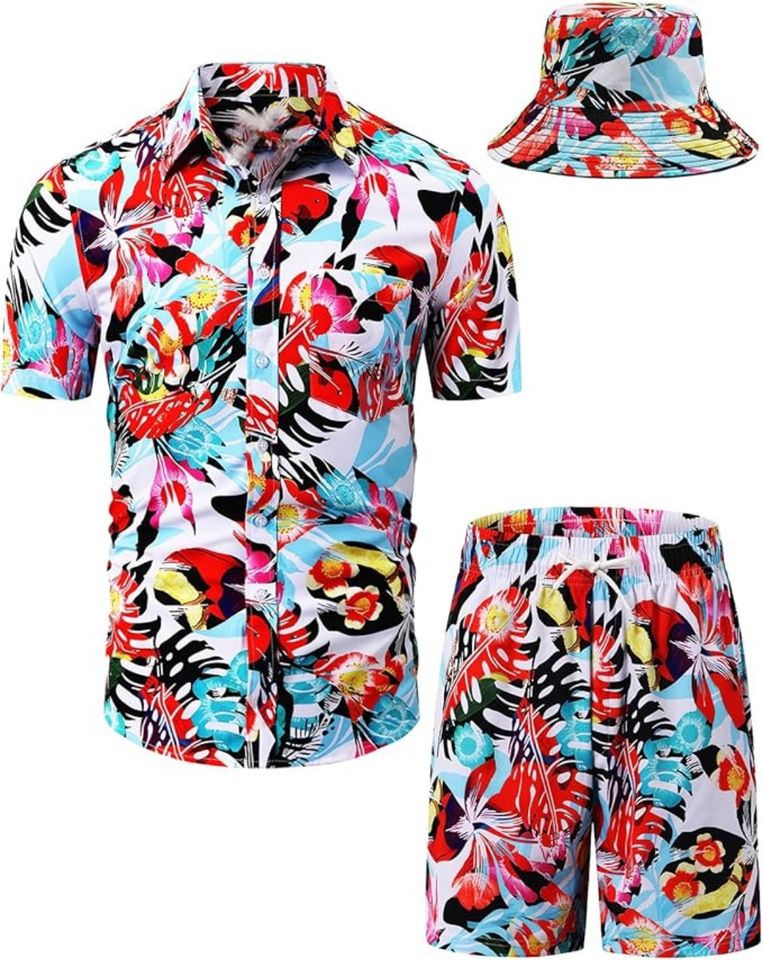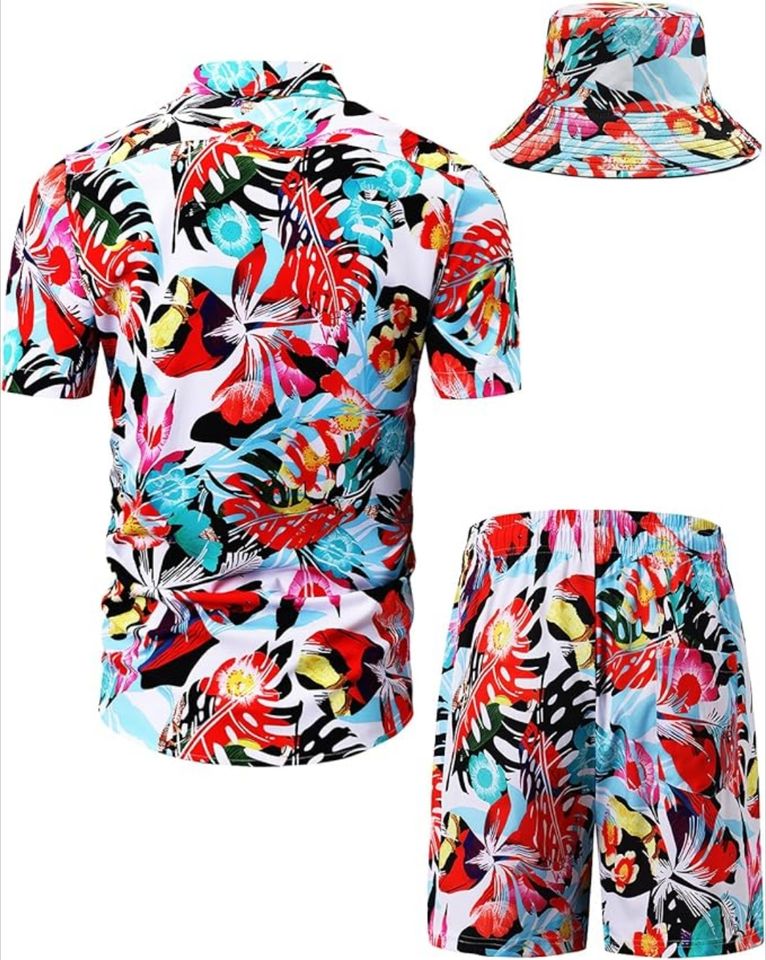 ชุดเซ็ต 3 ชิ้น เสื้อฮาวาย กางเกงขาสั้น และหมวกเข้าชุด สำหรับผู้ชาย ยี่ห้อ High Quality Ying Wears สไตล์วินเทจ ระบายอากาศได้ดี เหมาะสำหรับฤดูร้อน ใส่ไปเที่ยวชายหาด
