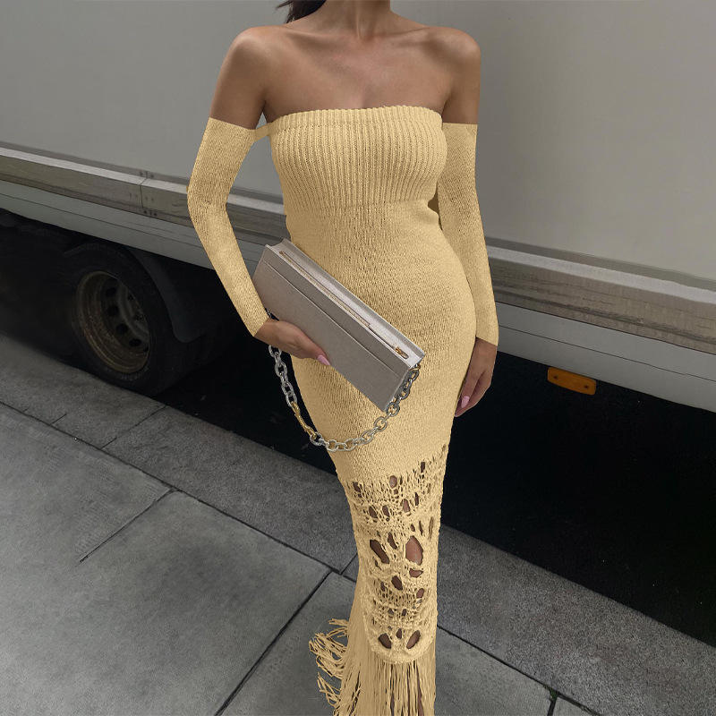 เดรสยาวขนแกะเปิดไหล่แขนยาวมีพู่ทรงเข้ารูปสำหรับฤดูใบไม้ผลิ2025