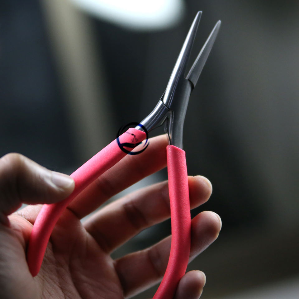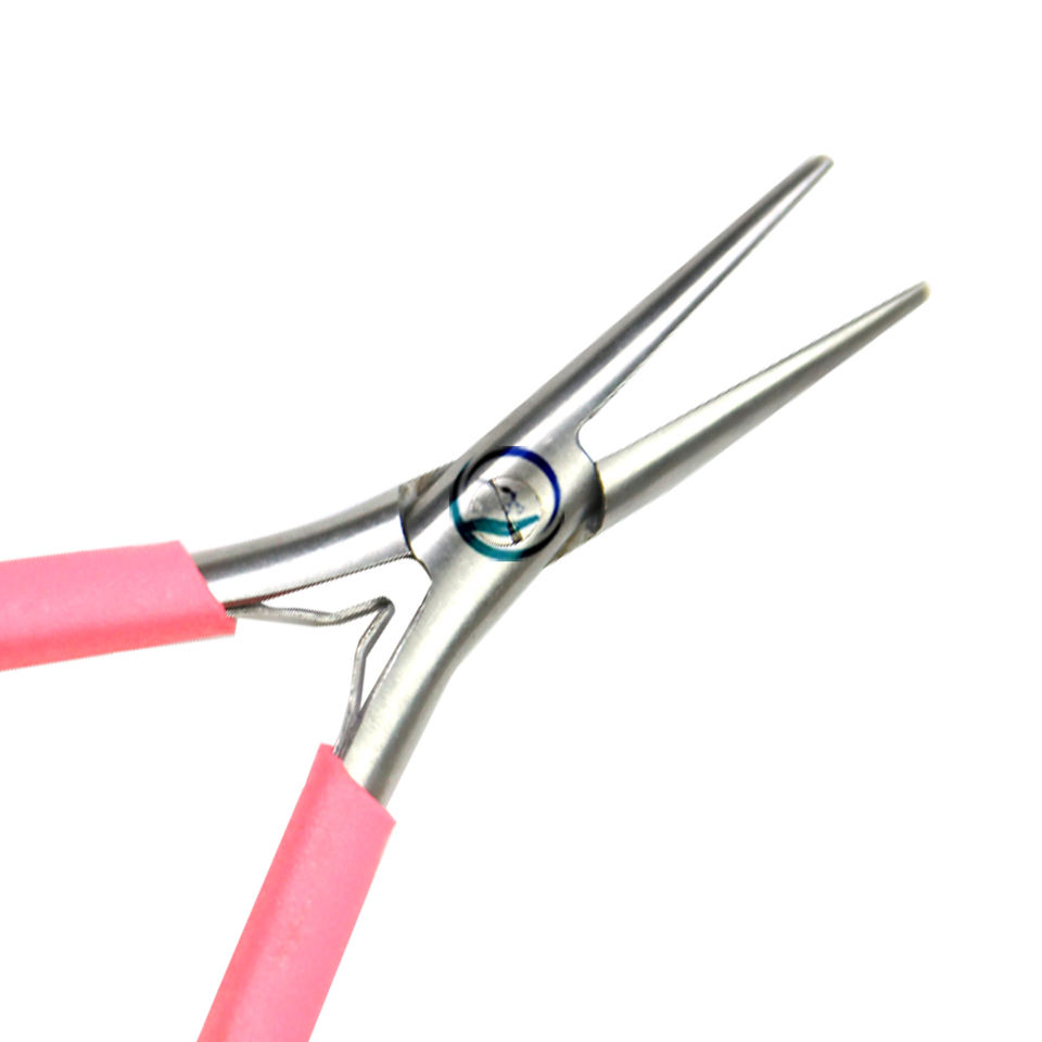 คีมต่อผมปากแบนยาวจมูกสีเงินพร้อมที่จับสีชมพู