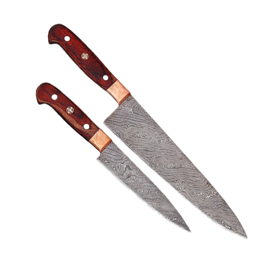 ชุดมีดเชฟเหล็กดามัสกัสทำด้วยมือปลอกหนังไม้เนื้อโลหะคาร์บอนสำหรับตัดผักในครัว