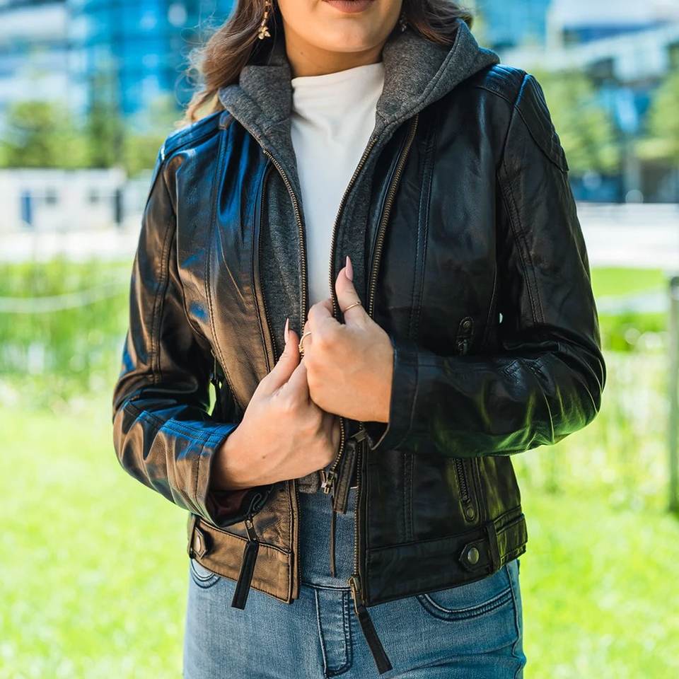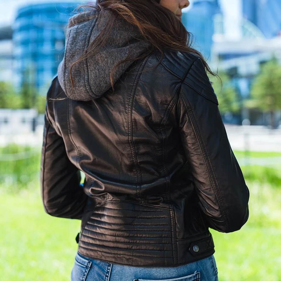 High Sales Custom Logo Black Hooded Women's Vintage Winter Stylish Genuine Leather Bomber Jacket Breathable Windproof Waterproof