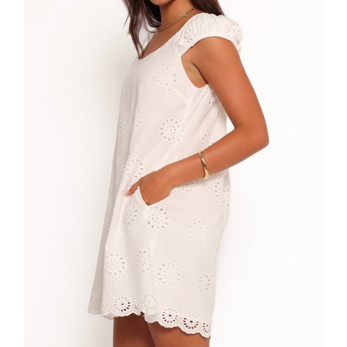 เดรสสั้นผู้หญิงสไตล์หรูหราประดับลูกปัด กระดุมติดอย่างประณีต ทรงสวยสมดุล ดีไซน์ทันสมัย ผ้าลินิน 100% เพื่อความมั่นใจ