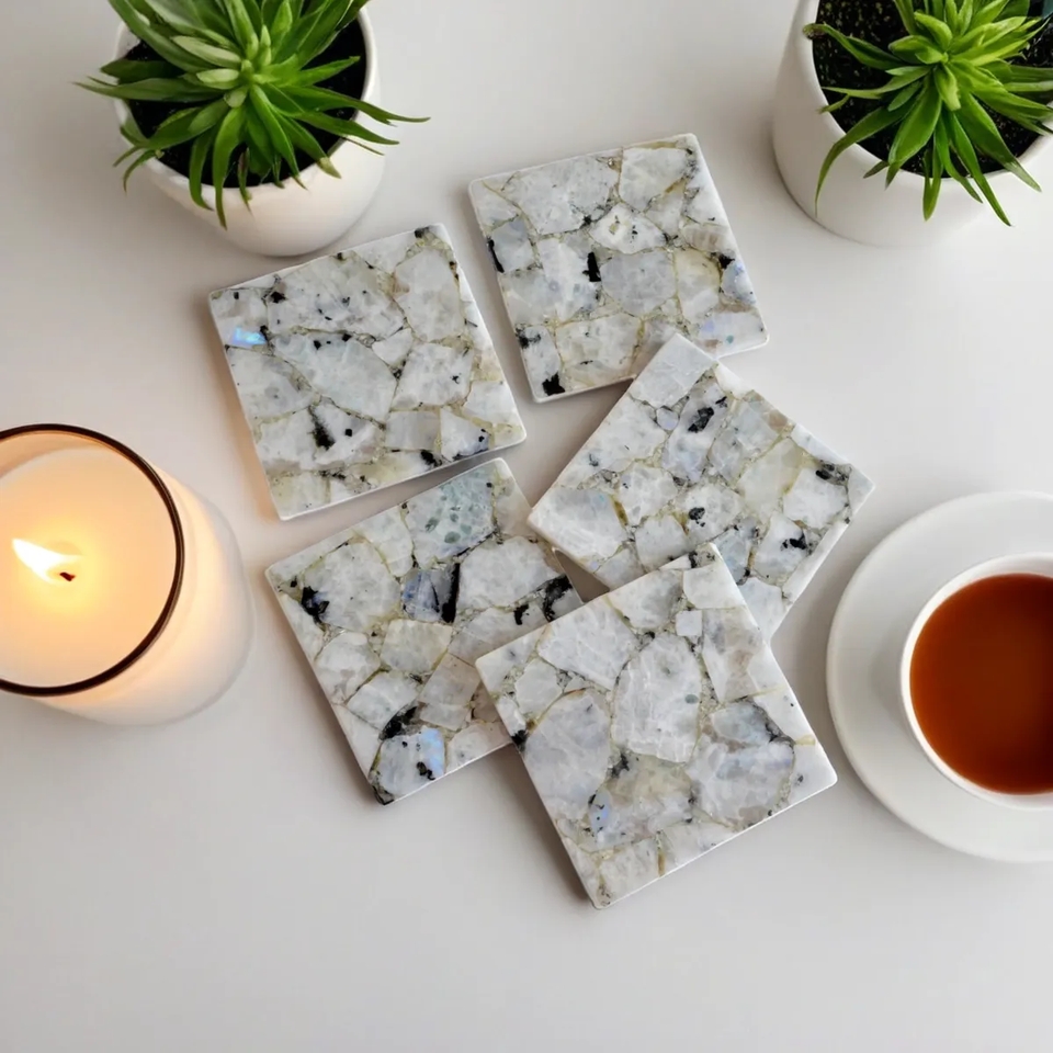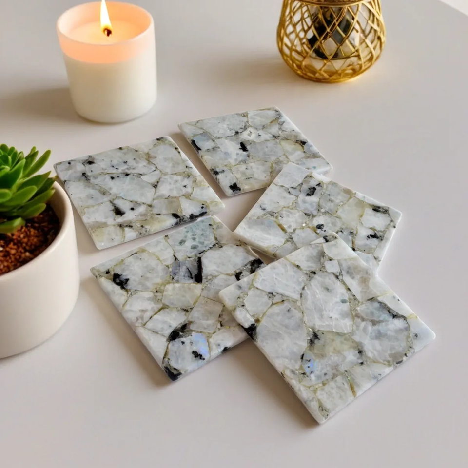 แผ่นรองแก้วมูนสโตนสีรุ้งขายดี ขายส่งหินสีขาวธรรมชาติและแผ่นรองแก้วดีไซน์สวยงามสำหรับตกแต่งโต๊ะและของตกแต่ง