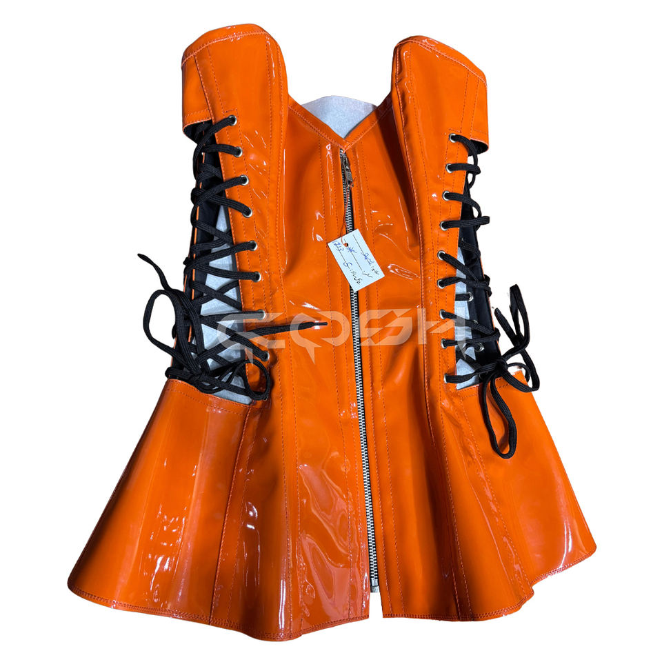 คอร์เซ็ตทรงโอเวอร์บัสต์สีส้มเงาสูง ผลิตจาก PVC พร้อมโครงเหล็กเสริม ซิปด้านหน้า และเชือกผูกปรับได้ด้านข้าง