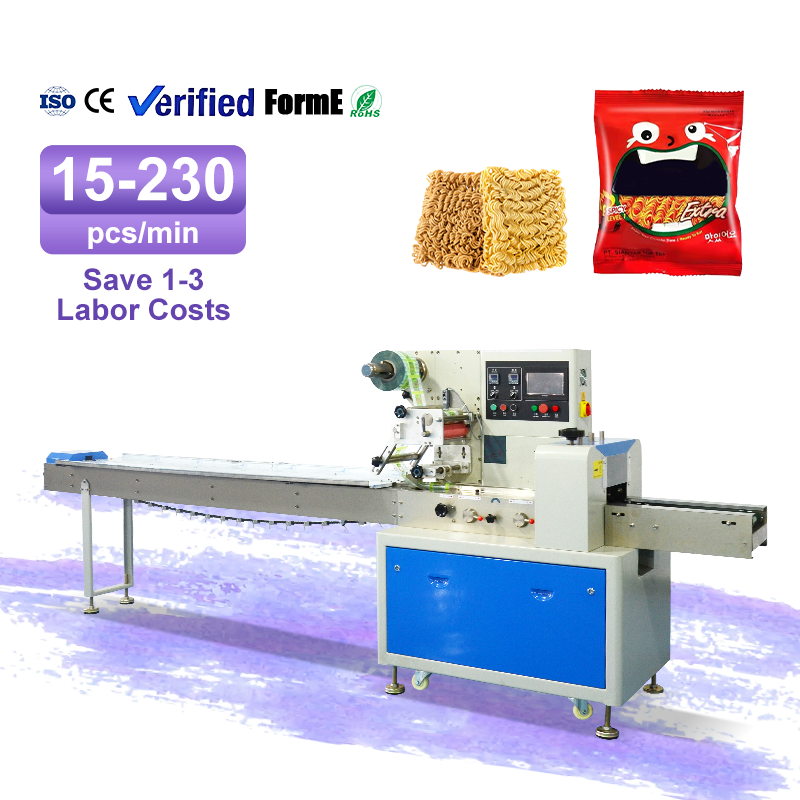 เครื่องบรรจุภัณฑ์แบบไหลแนวนอนอัตโนมัติความเร็วสูงสำหรับบะหมี่กึ่งสำเร็จรูปและเกี๊ยวแช่แข็ง