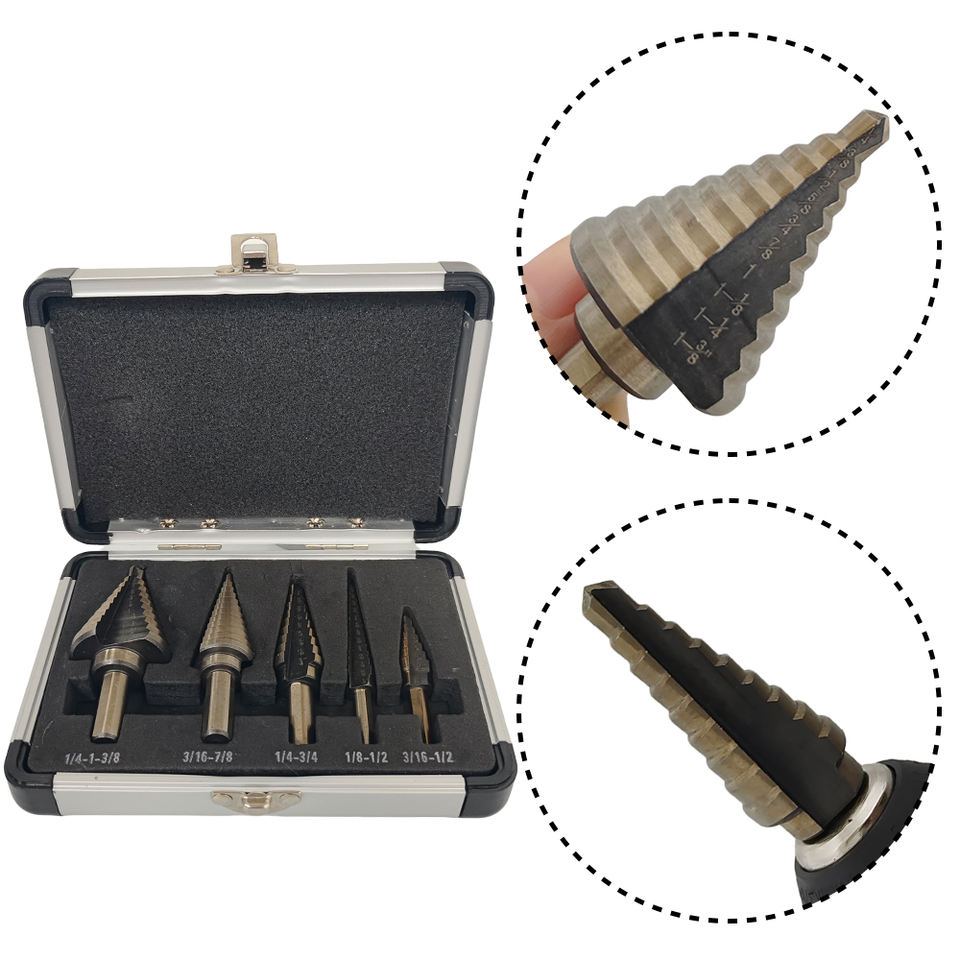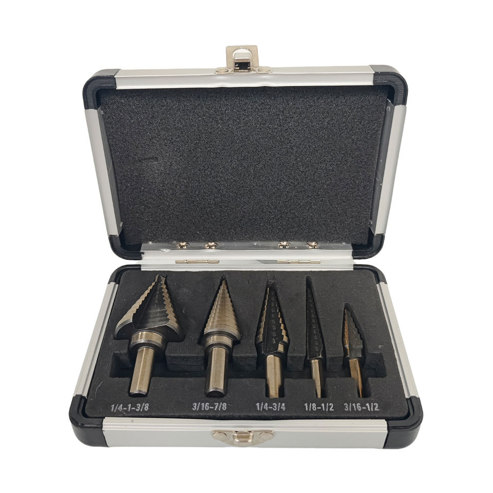 ดอกสว่านเจาะรูหลายขนาด 5 ชิ้น ทำจากเหล็กความเร็วสูง พร้อมกล่องอลูมิเนียม