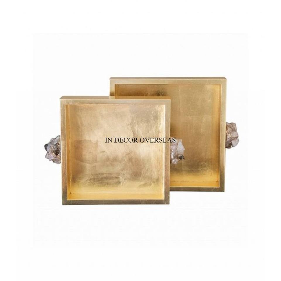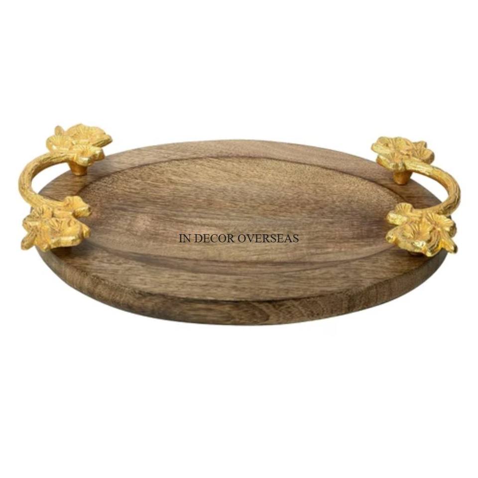 ถาดเสิร์ฟทรงสี่เหลี่ยมผืนผ้าทำจากไม้มะม่วงพร้อมที่จับดีไซน์ดอกไม้โลหะชุบทอง
