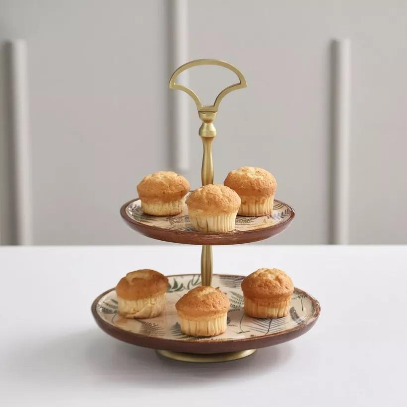 ขาตั้งเค้กไม้คุณภาพสูงมาตรฐานสูงดีไซน์ไม่ซ้ําใครที่วางคัพเค้ก 3 ชั้นพร้อมที่จับโลหะและฐานเท้าสําหรับขาย
