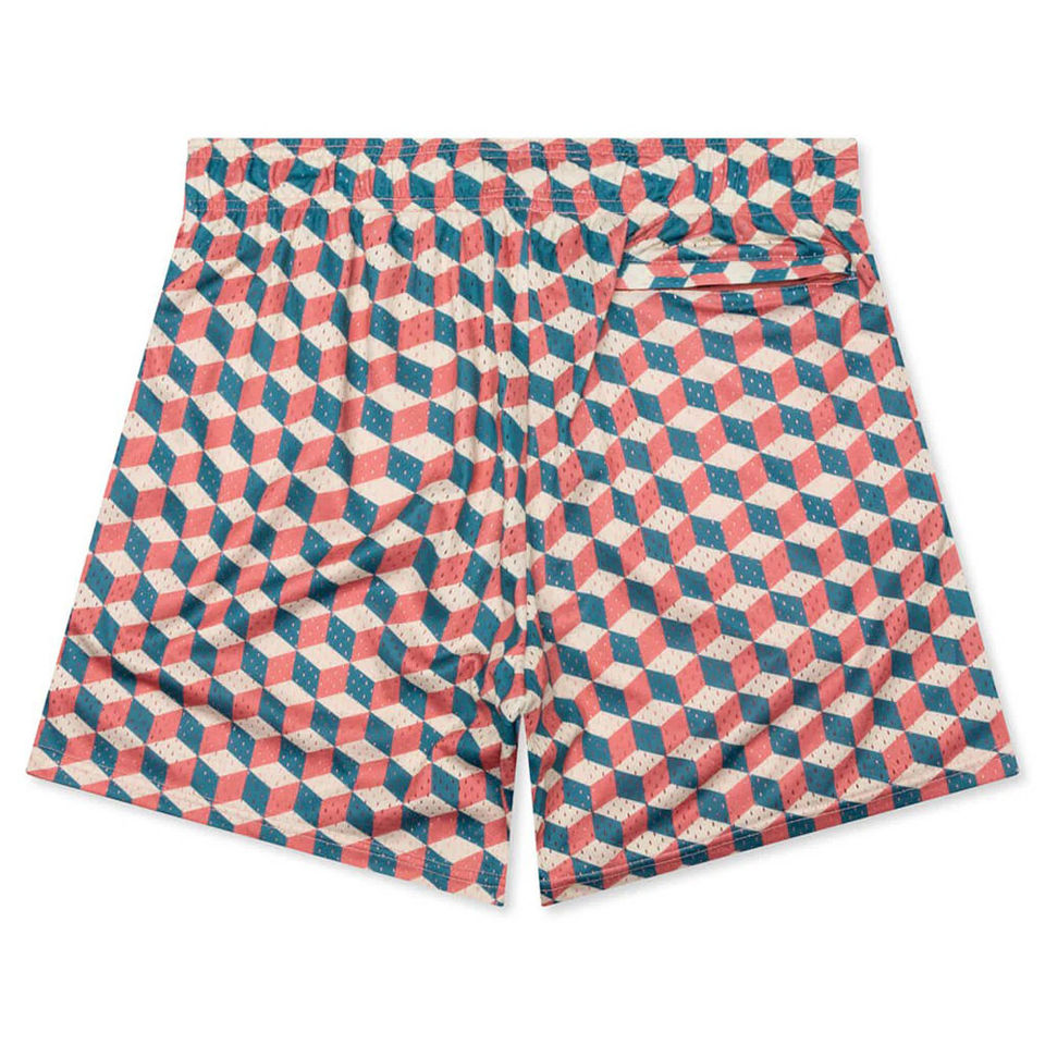 กางเกงขาสั้นตาข่ายเอวยางยืดพิมพ์ลายเป็นมิตรต่อสิ่งแวดล้อมกางเกงขาสั้นตาข่ายออกแบบได้ตามต้องการดีไซน์แบบไฮสตรีท