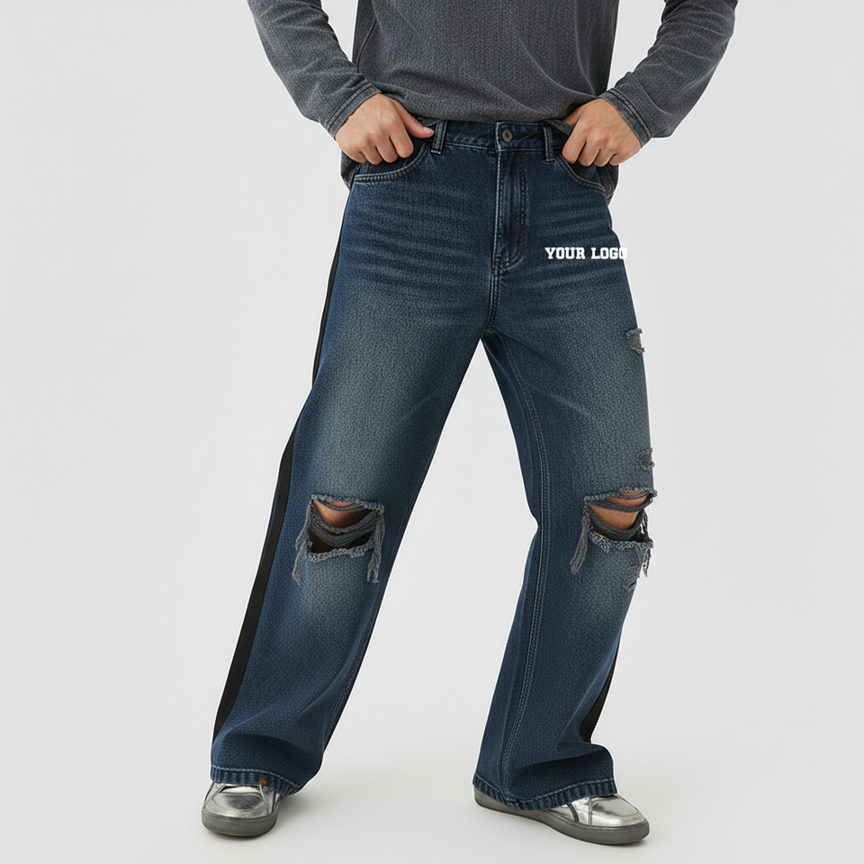 กางเกงยีนส์ปักโลโก้ High Street แบบสั่งทำพิเศษสำหรับผู้ชาย ทรงขากว้าง ขาดๆ แบบลำลอง สไตล์สตรีทแวร์ ลุคทำสีซีดขาดๆ