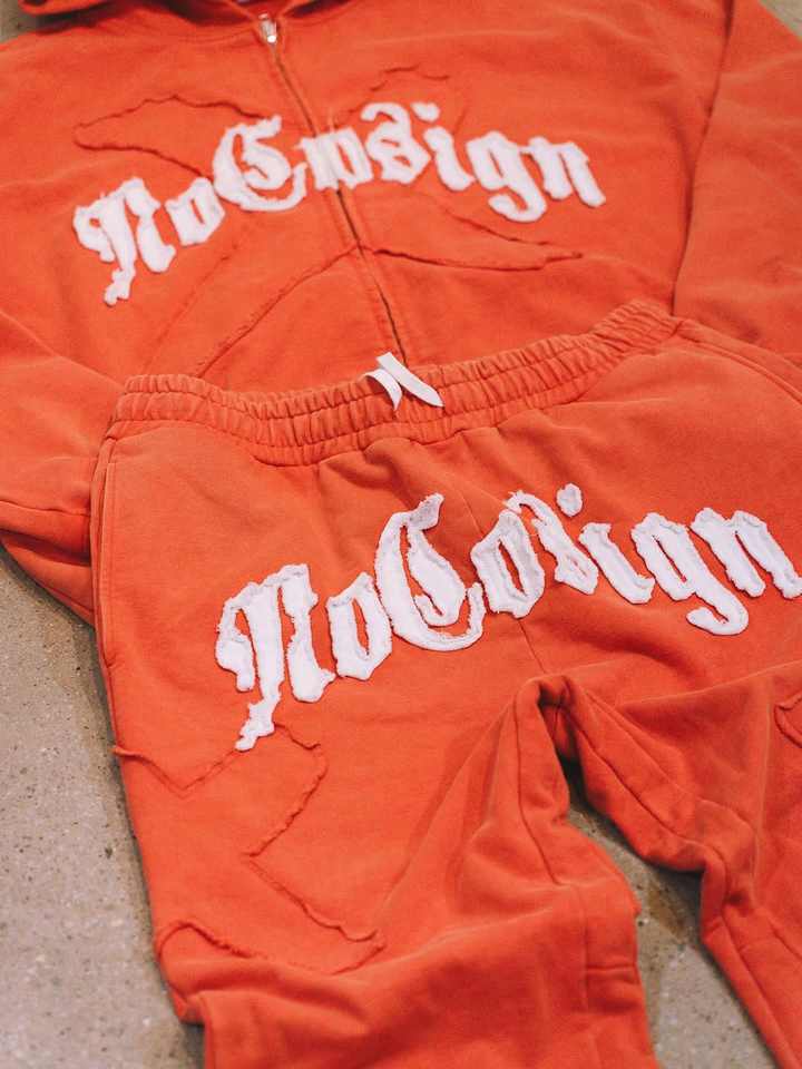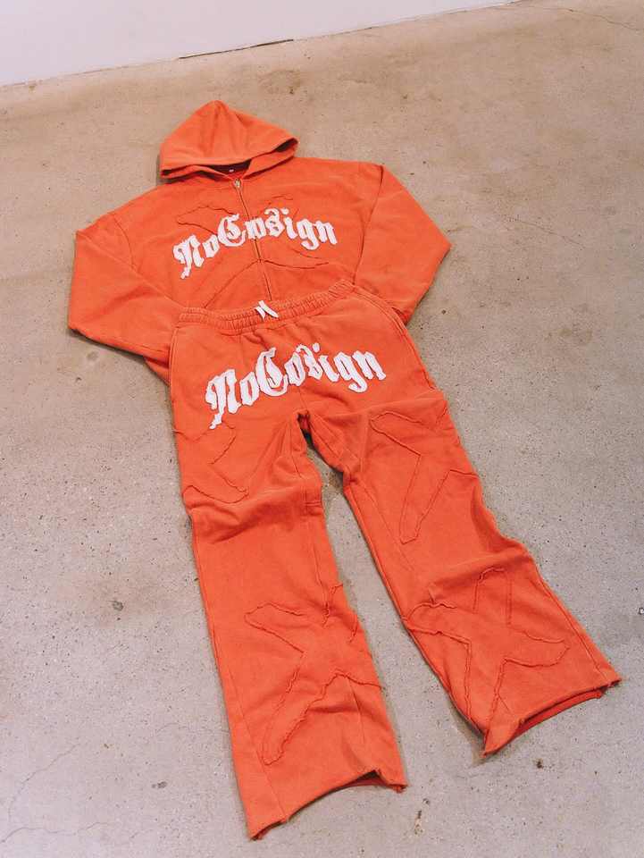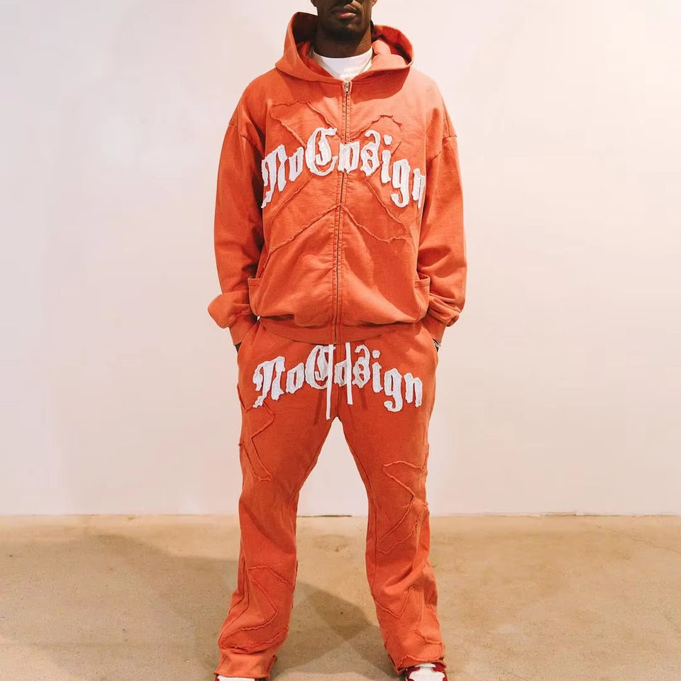 ชุดเซ็ตแทรคสูทผู้ชายแบบมีฮู้ดทรงโอเวอร์ไซส์ สไตล์ดิสเทรส แต่งแพทช์เวิร์ค พร้อมโลโก้สั่งทำพิเศษ รุ่น High Street Heavyweight พร้อมกางเกงขายาวทรงตรง