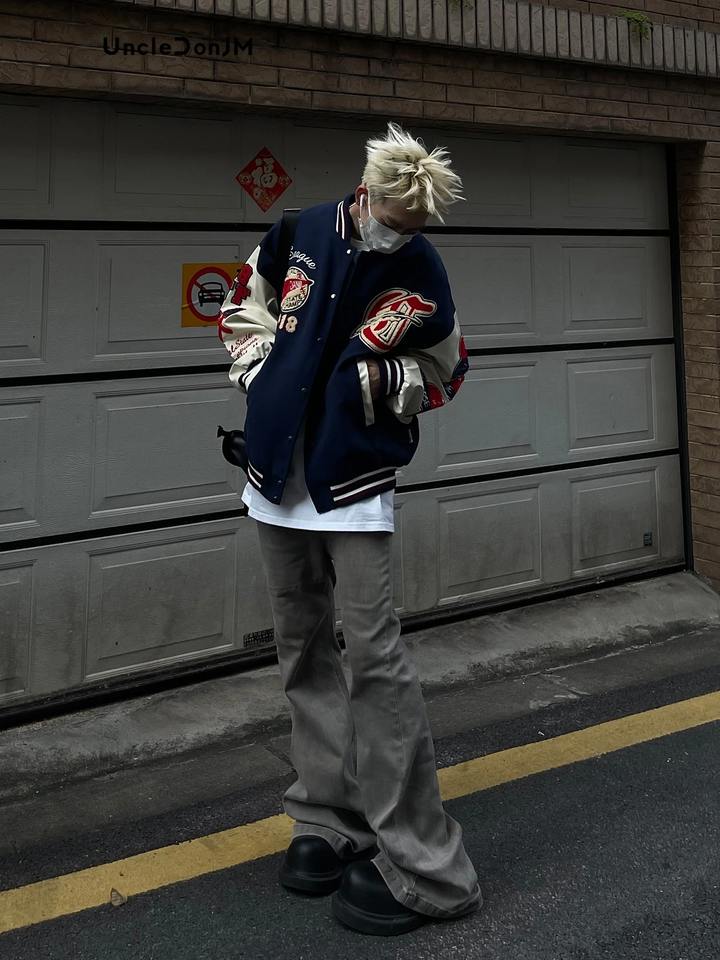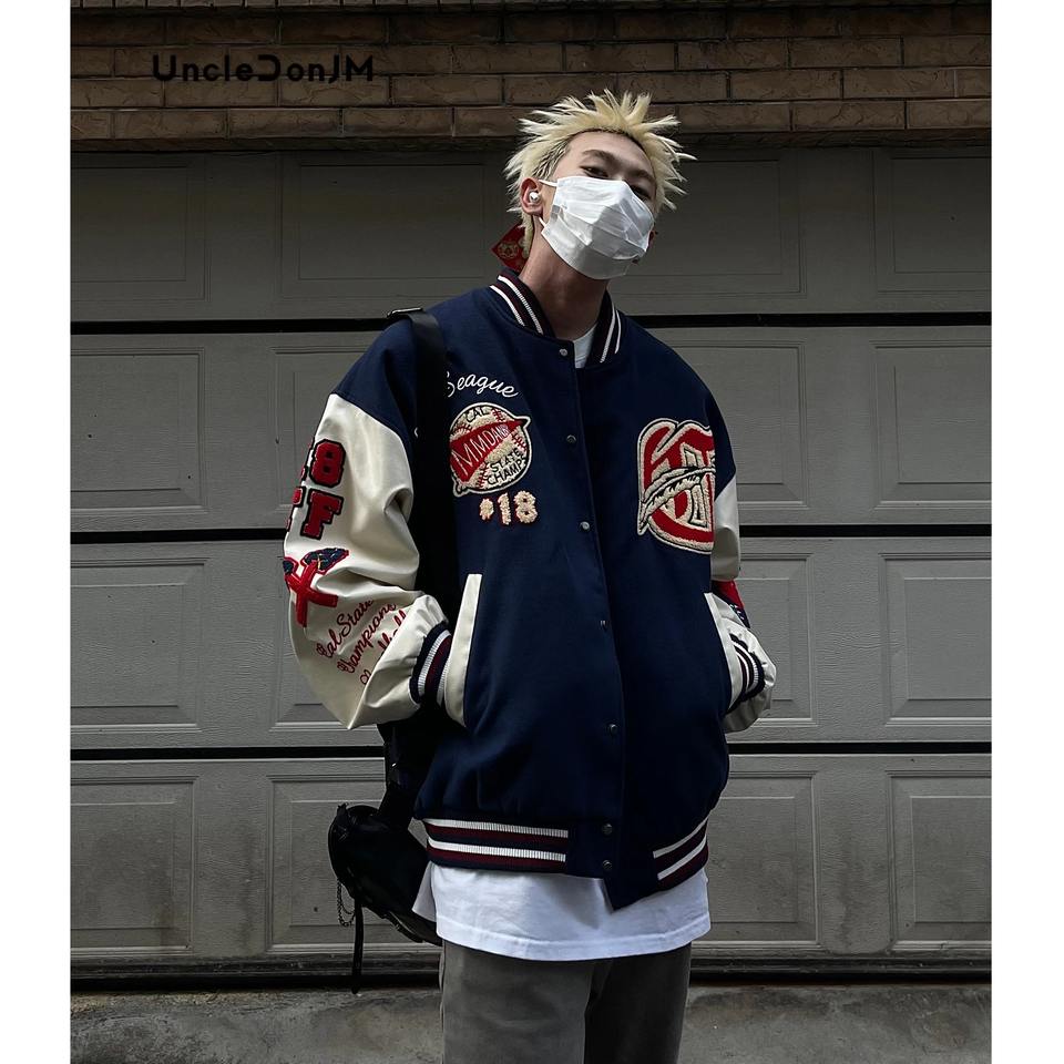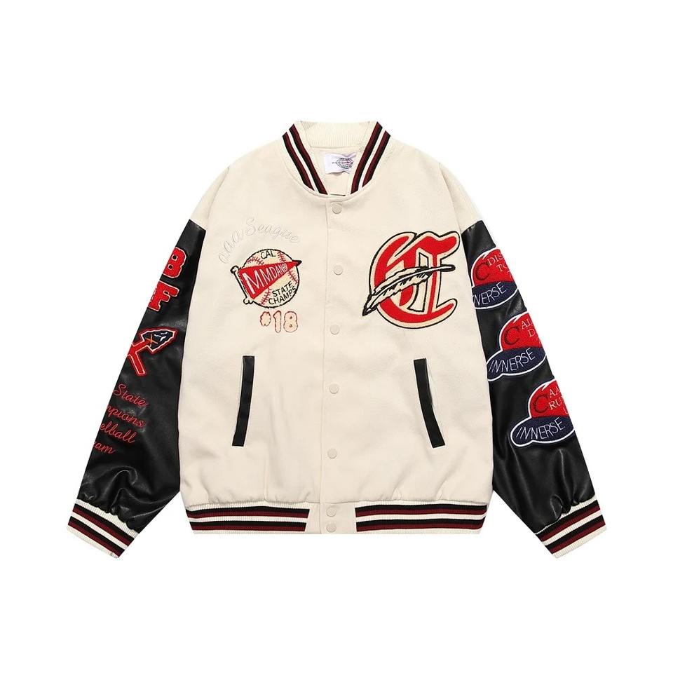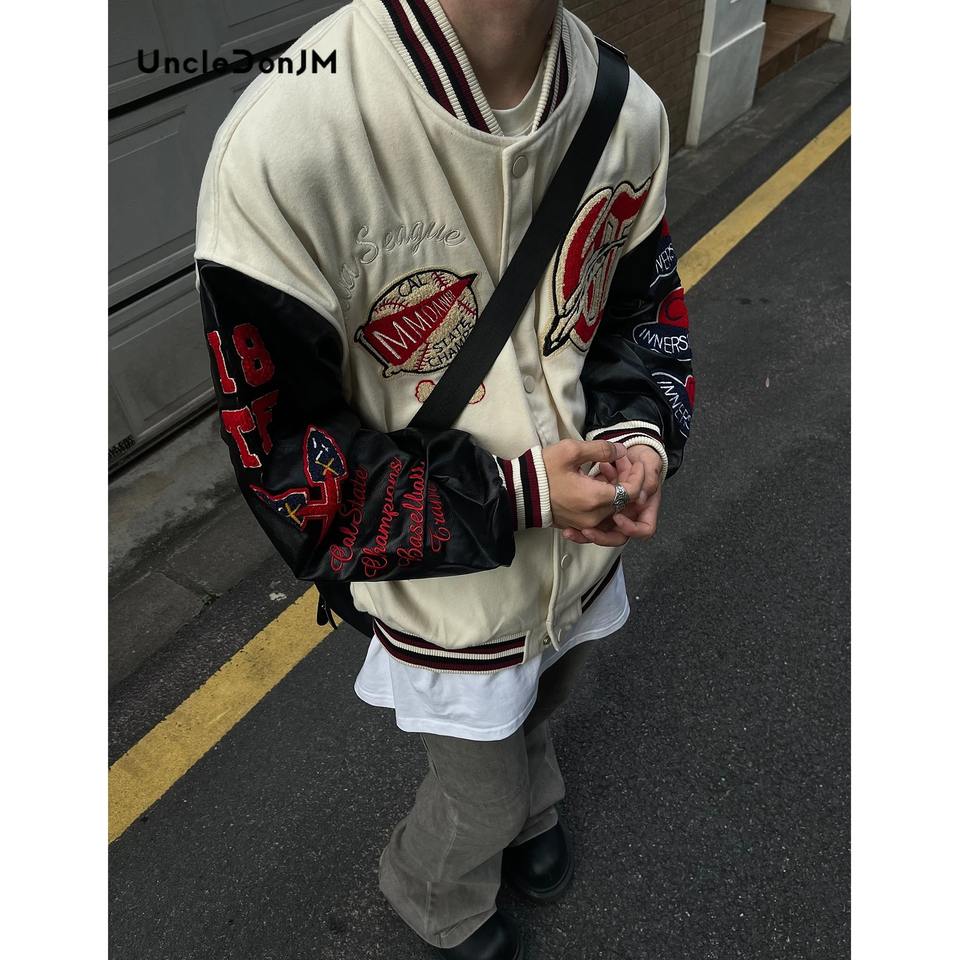 เสื้อแจ็กเก็ตเบสบอลของผู้ชายแนวสตรีทเสื้อแจ็กเก็ตทีมมหาวิทยาลัยงานเย็บปะติดเสื้อวินเทจแขนเสื้อหนัง PU แบบหลวมฮิปฮอป
