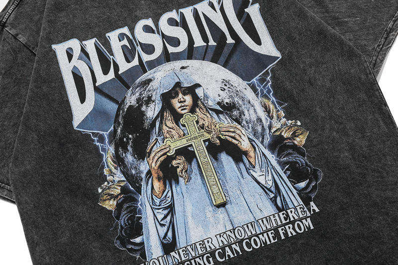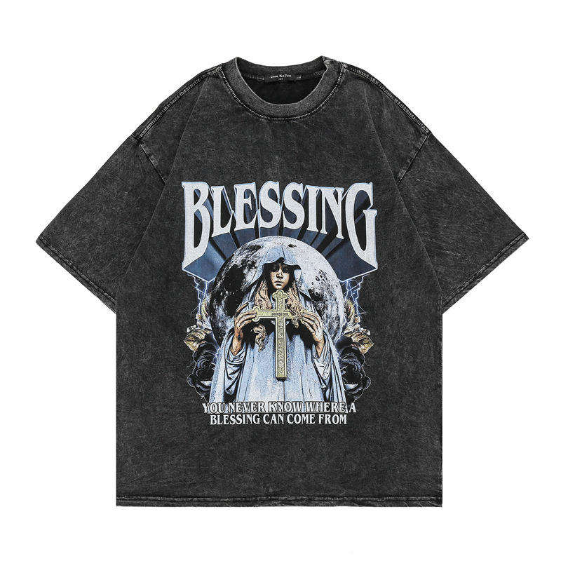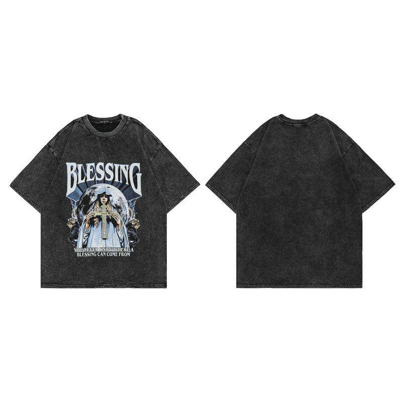 เสื้อยืดแขนสั้นสไตล์ฮิปฮอปสำหรับผู้ชาย ลุคซีดแบบวินเทจ แนวเวสต์โคสต์ สีเข้ม สไตล์ลำลอง เสื้อผ้าผู้ชาย