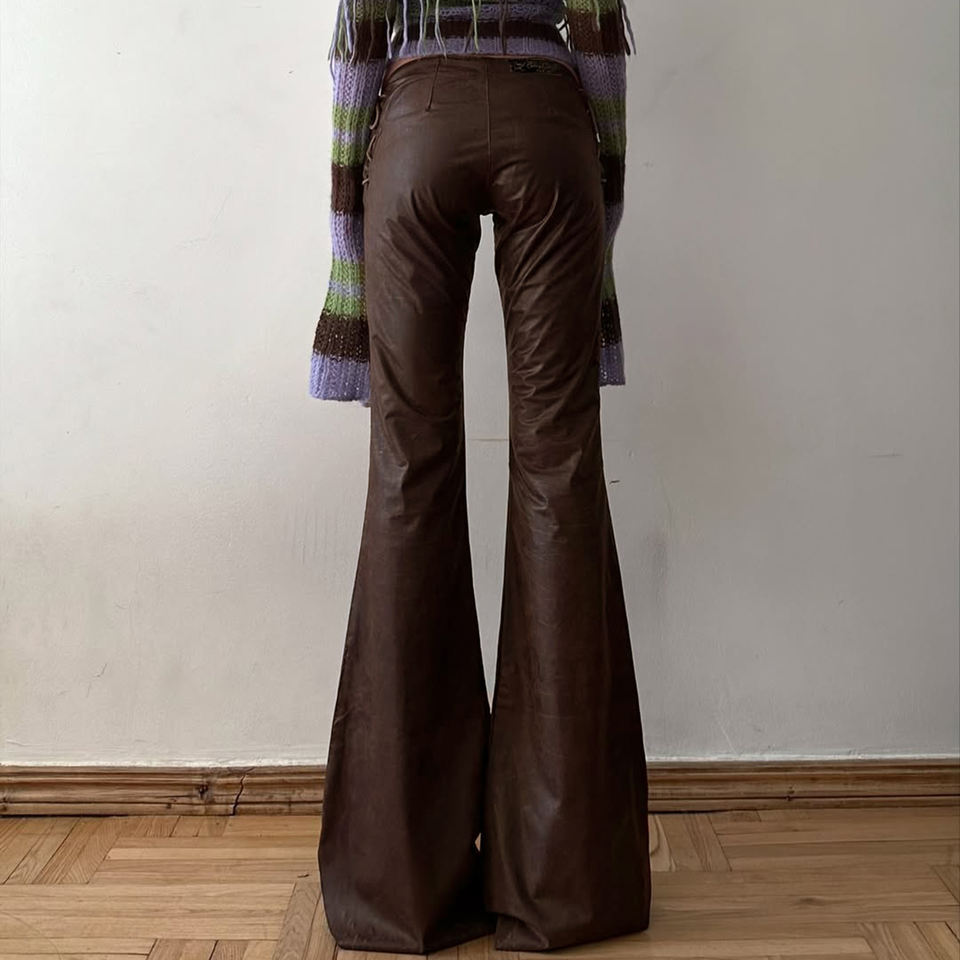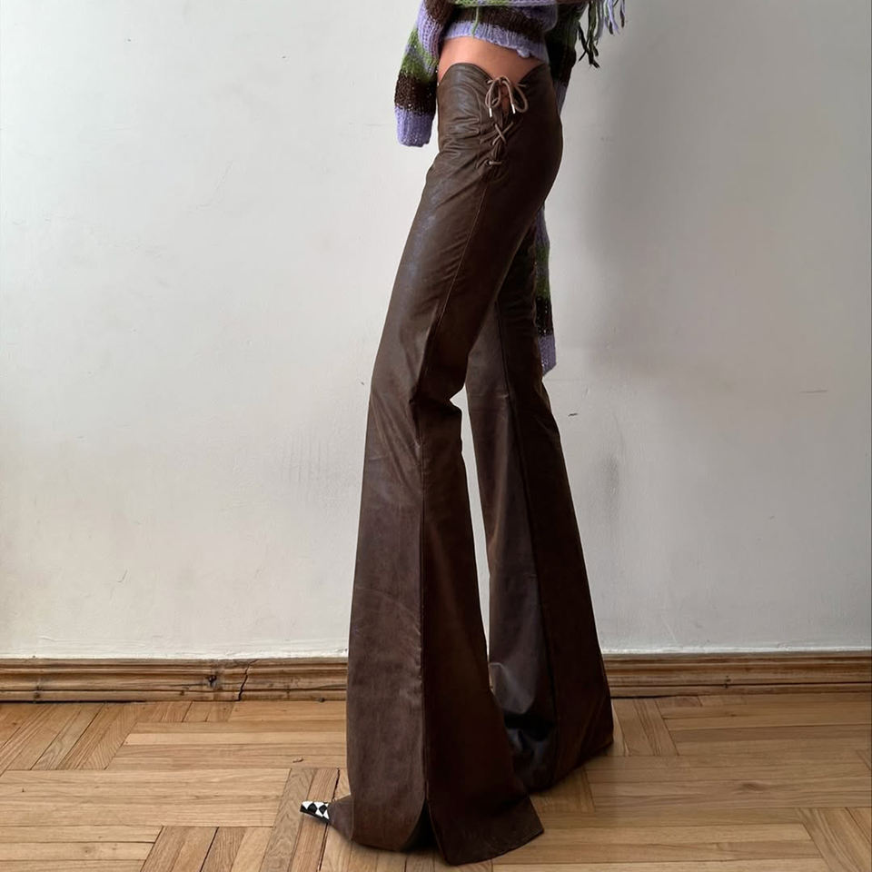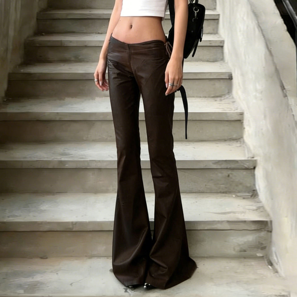 กางเกงหนัง PU สีน้ำตาลเข้มสไตล์วินเทจสำหรับผู้หญิง เอวต่ำ มีเชือกผูกโบว์ ทรงเข้ารูป ขาบานเล็กน้อย