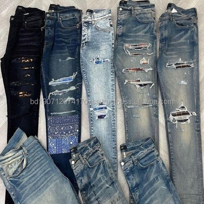 กางเกงยีนส์ผู้ชายทรงสลิมขาเดฟ ยี่ห้อ High Street Wind AM แบบปักลาย ขาดๆ ยับๆ สไตล์สตรีทแวร์ ลุคสบายๆ ผ้าเดนิมฟอกสี
