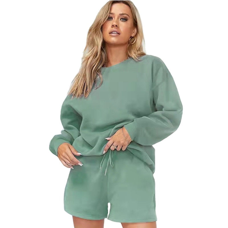 ชุดเซ็ตเสื้อฮู้ดดี้และกางเกงขาสั้นผ้าคอตตอนเทอร์รี่ทรงหลวมสำหรับผู้หญิง แบรนด์ High Street คุณภาพพรีเมียม รับสกรีนโลโก้