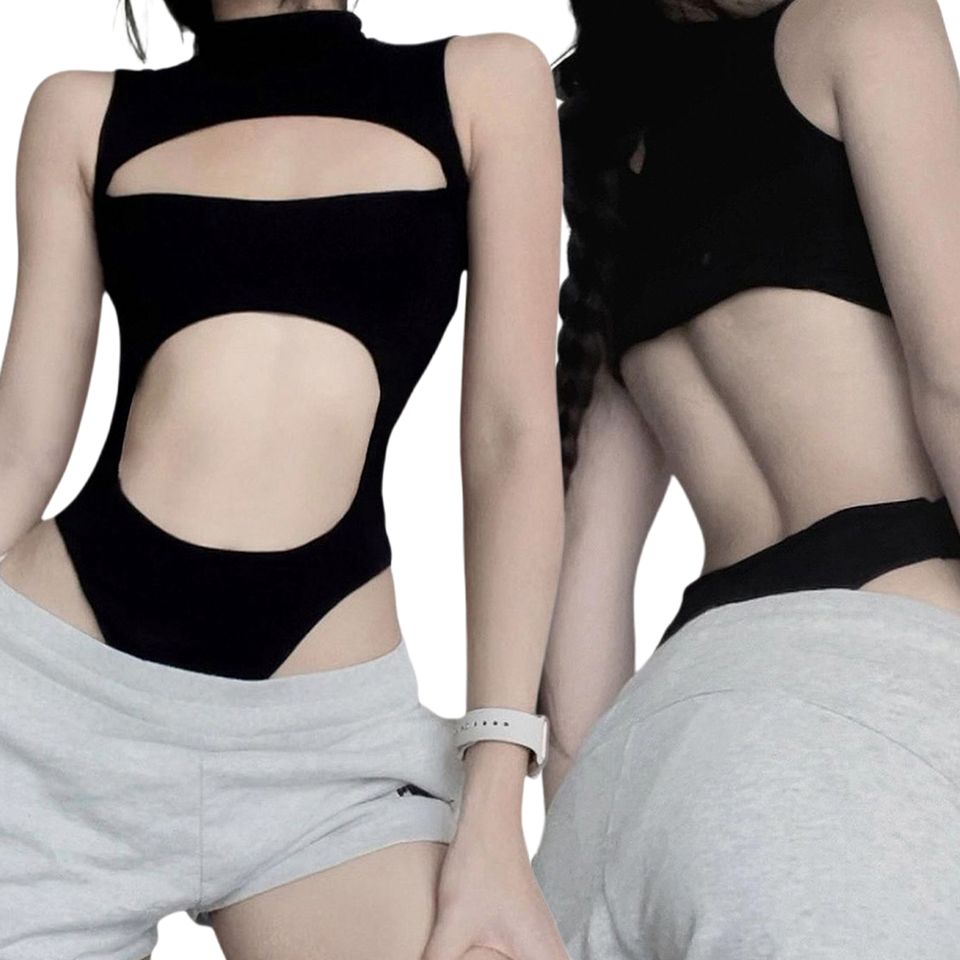 บอดี้สูทผ้ายืดสูงสำหรับฤดูร้อน ทรงเข้ารูปเซ็กซี่ ตัดเย็บด้วยผ้าตาข่าย คอสูง แขนกุด ผ้าถักเนื้อแน่น