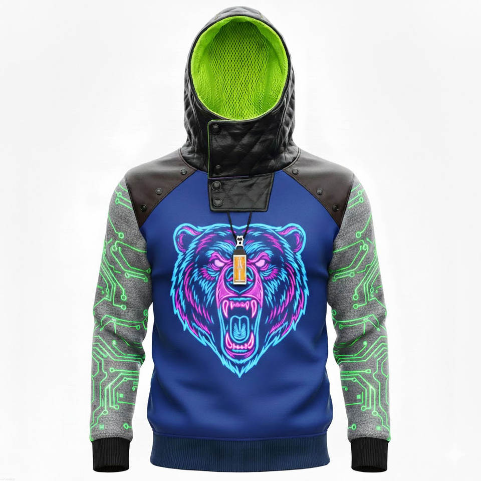 เสื้อฮู้ดผู้ชายไฮเทค ลายกราฟิกนีออนตรงกลางและลายวงจรบนแขนเสื้อ สไตล์ไซเบอร์พังก์สีสันสดใส