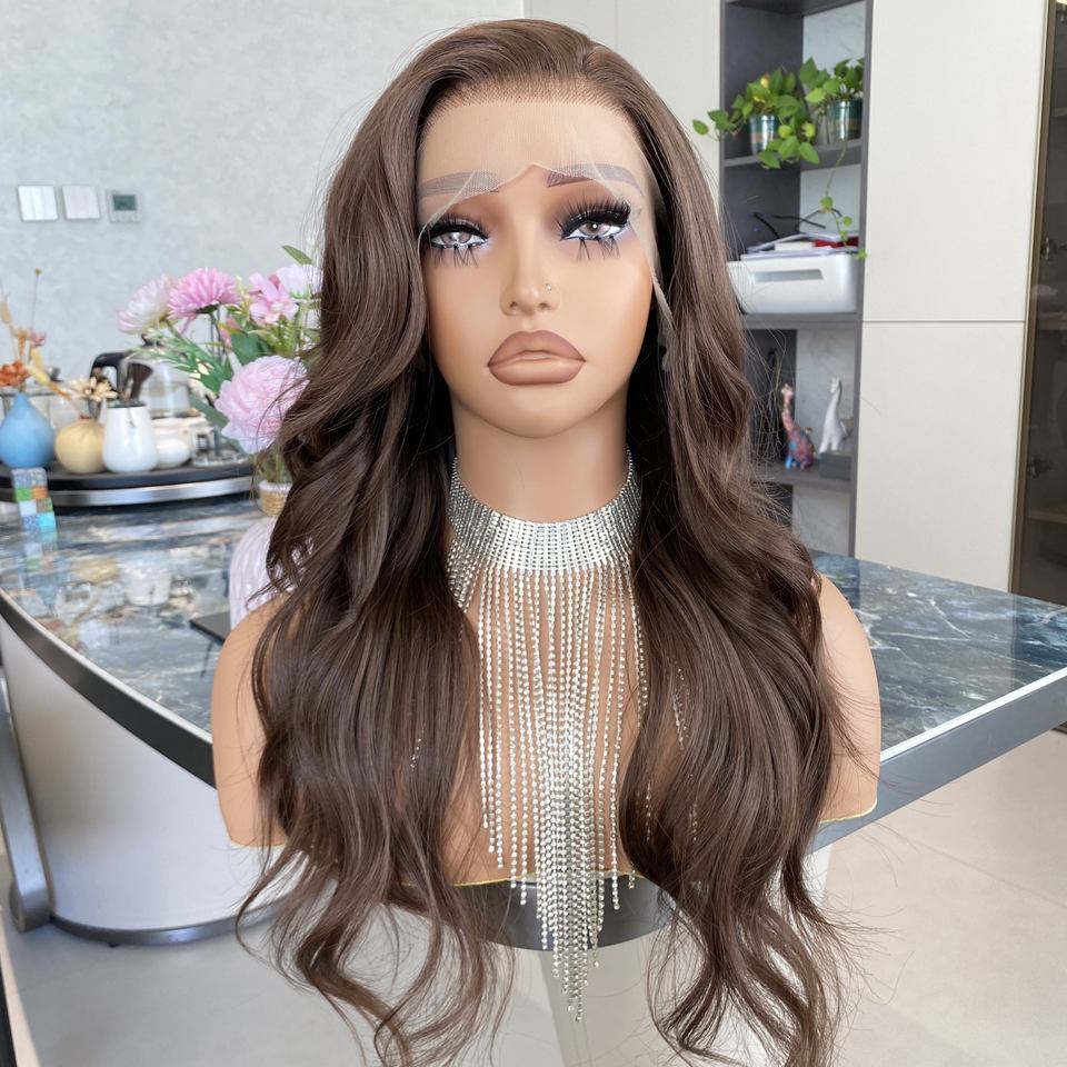 วิกผมใยสังเคราะห์แบบติดกาวสำเร็จรูป ทรงลอนยาวสีน้ำตาล ขนาด 13x4 สำหรับผู้หญิง ทนความร้อนสูง พร้อมผมด้านหน้าที่ถักเป็นลูกไม้