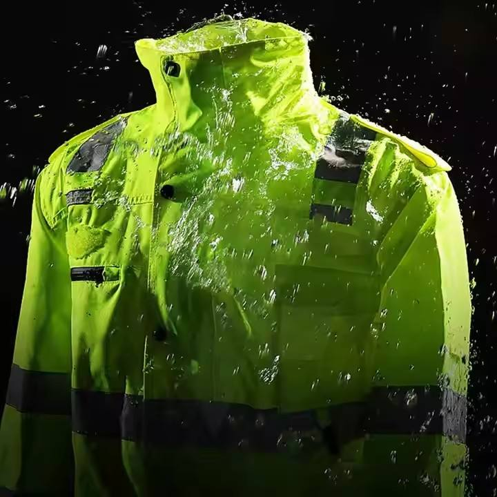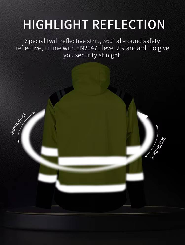 เสื้อแจ็คเก็ตนิรภัยสะท้อนแสงสีเขียวแบบกันน้ำ ANSI Class 2 ความปลอดภัยสูง ปรับแต่งได้สำหรับงานก่อสร้าง ขนาด S-4XL