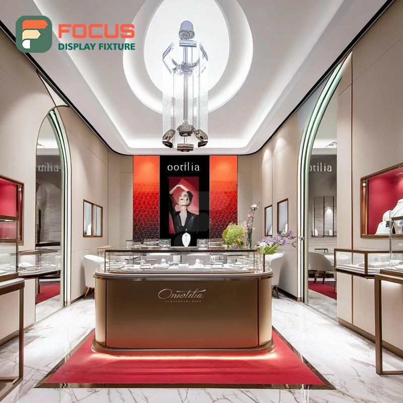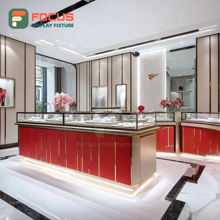 ตู้โชว์เครื่องประดับแบบโปร่งแสงสำหรับร้านค้า พื้นผิวขัดเงา สำหรับพื้นที่บูติก