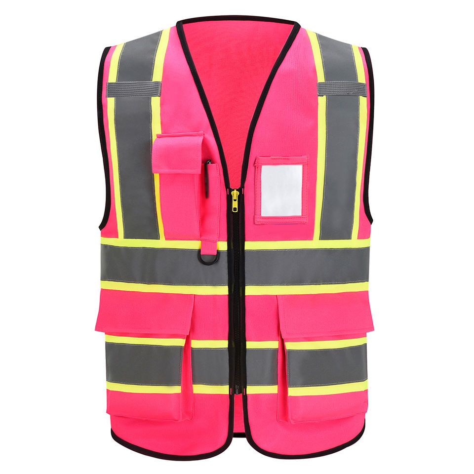 เสื้อกั๊กนิรภัยมองเห็นได้ชัดเจนเสื้อกั๊กทำงานมีแถบสะท้อนแสงและซิปสีเหลืองส้ม XS-6XL ใช้ได้ทั้งชายและหญิง
