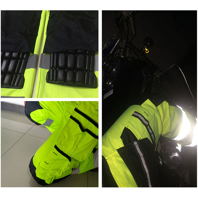 ชุดเสื้อผ้าทำงานเพื่อความปลอดภัยแบบมองเห็นได้ชัดเจน สีเหลืองสะท้อนแสง พร้อมกางเกงและสนับเข่า กันน้ำ