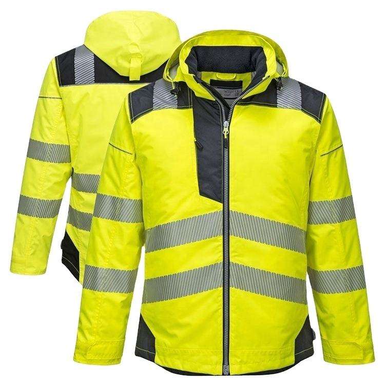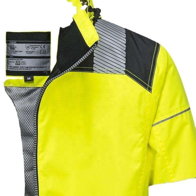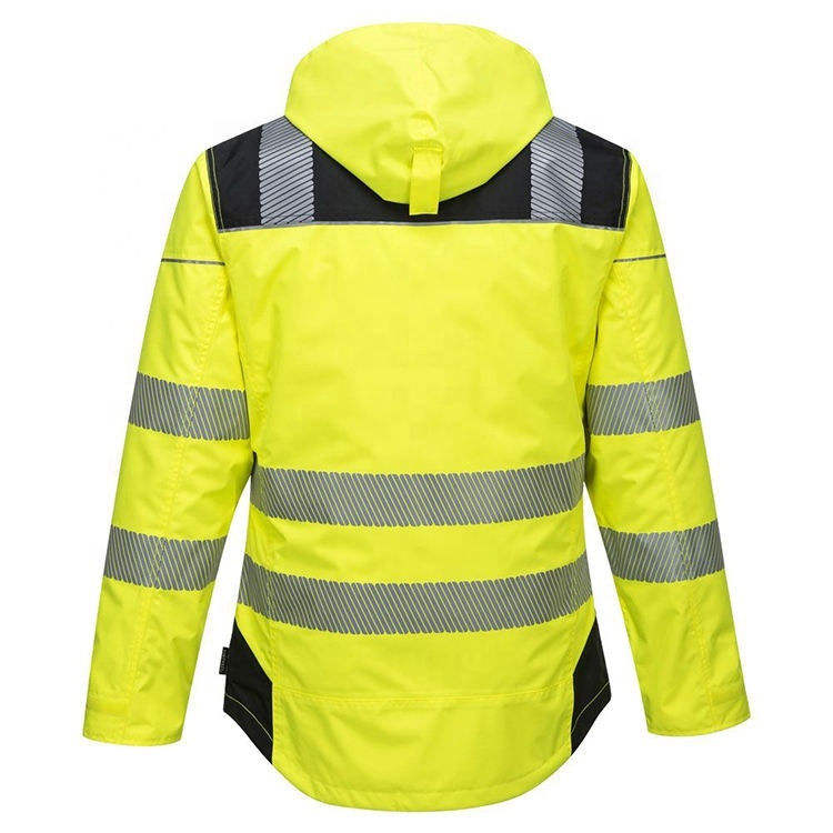 เสื้อแจ็กเก็ตสะท้อนแสงมีฮู้ดหุ้มฉนวนป้องกันความปลอดภัยกันน้ำทัศนวิสัยมองเห็นได้ชัดเจนสำหรับงานก่อสร้างงานถนน