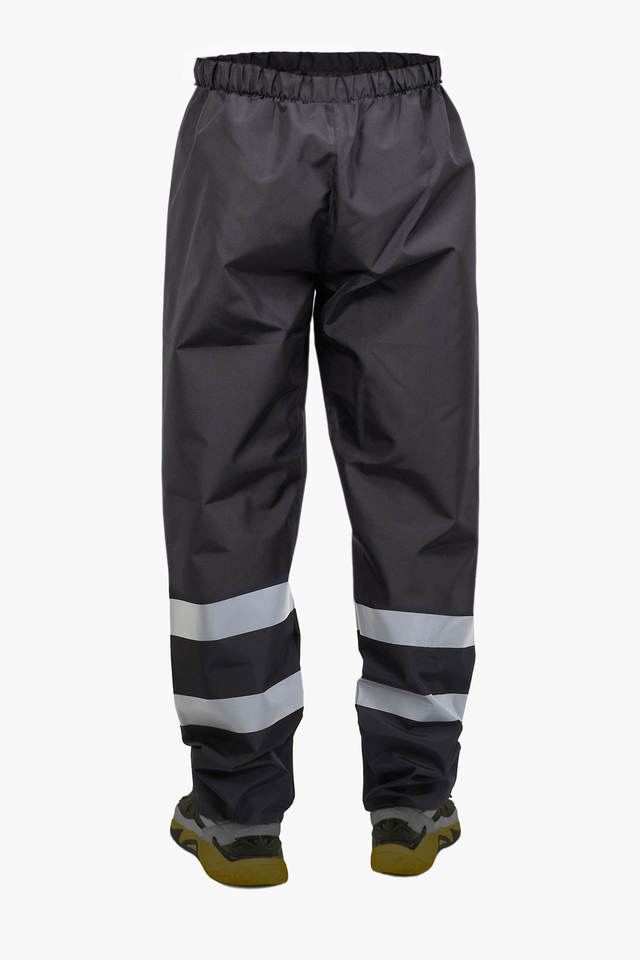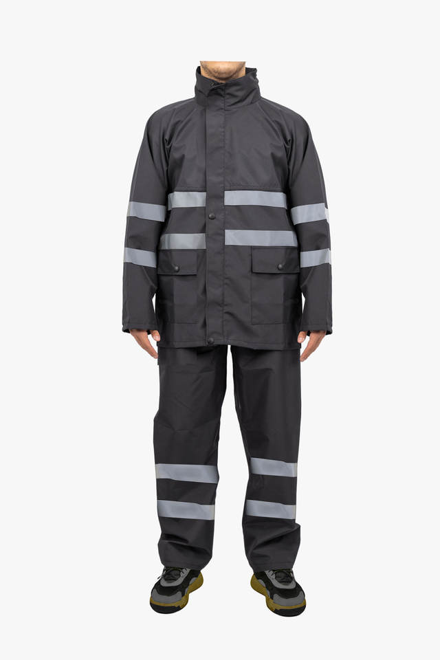 ชุดกันฝนกันลมกันน้ำเคลือบ PU สีเหลืองมองเห็นได้ชัดเจนเสื้อแจ็กเก็ตกางเกงพร้อมแถบสะท้อนแสงเพื่อความปลอดภัยในการทำงานใช้งานกลางแจ้ง