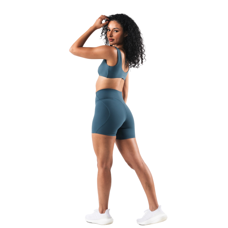 กางเกงขาสั้นเอวสูงสีเขียวอมฟ้าเข้มสำหรับผู้หญิง ทรงกระชับ เหมาะสำหรับออกกำลังกาย ช่วยกระชับสัดส่วน ใส่เล่นกีฬา