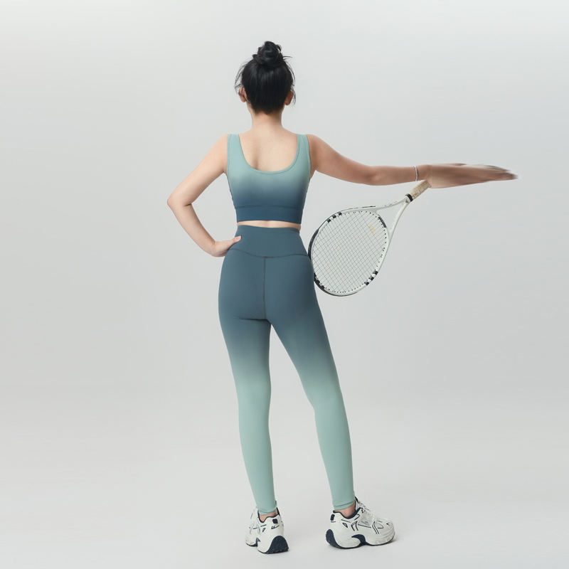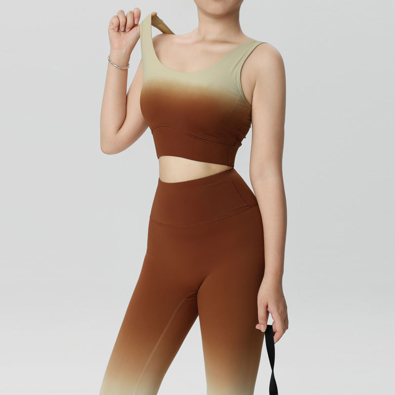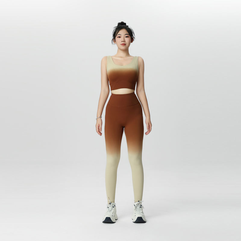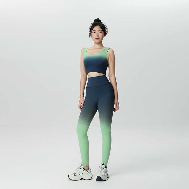 กางเกงโยคะเอวสูงไล่เฉดสี ผ้าไนลอนเนื้อนุ่ม สวมใส่สบาย เหมาะสำหรับพักผ่อน พร้อมโลโก้สั่งทำ ชุดเลกกิ้งโยคะผู้หญิง 2 ชิ้น สวมใส่สบาย
