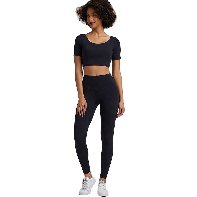 ชุดเสื้อผ้าโยคะเอวสูงแบบกลับด้านได้เสื้อเชิ้ตแขนสั้นเลกกิ้งไซส์ใหญ่พิเศษสำหรับเล่นกีฬาฟิตเนส