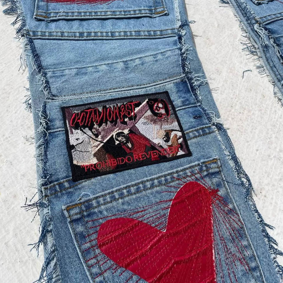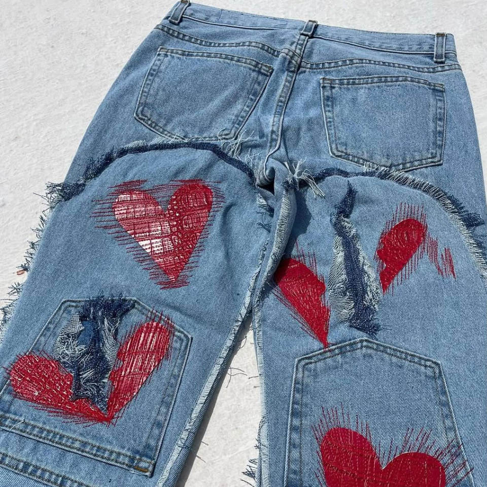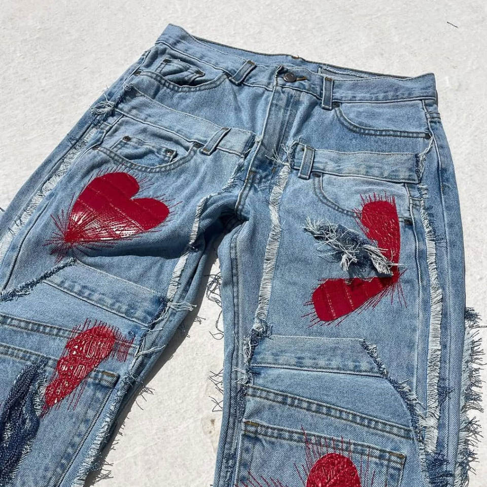 กางเกงเอวสูงทรงหลวมสไตล์สตรีทของผู้ชายกางเกงยีนส์แบบซ้อนกันมีรอยขาดทันสมัยดีไซน์ตามสั่งสไตล์สตรีท