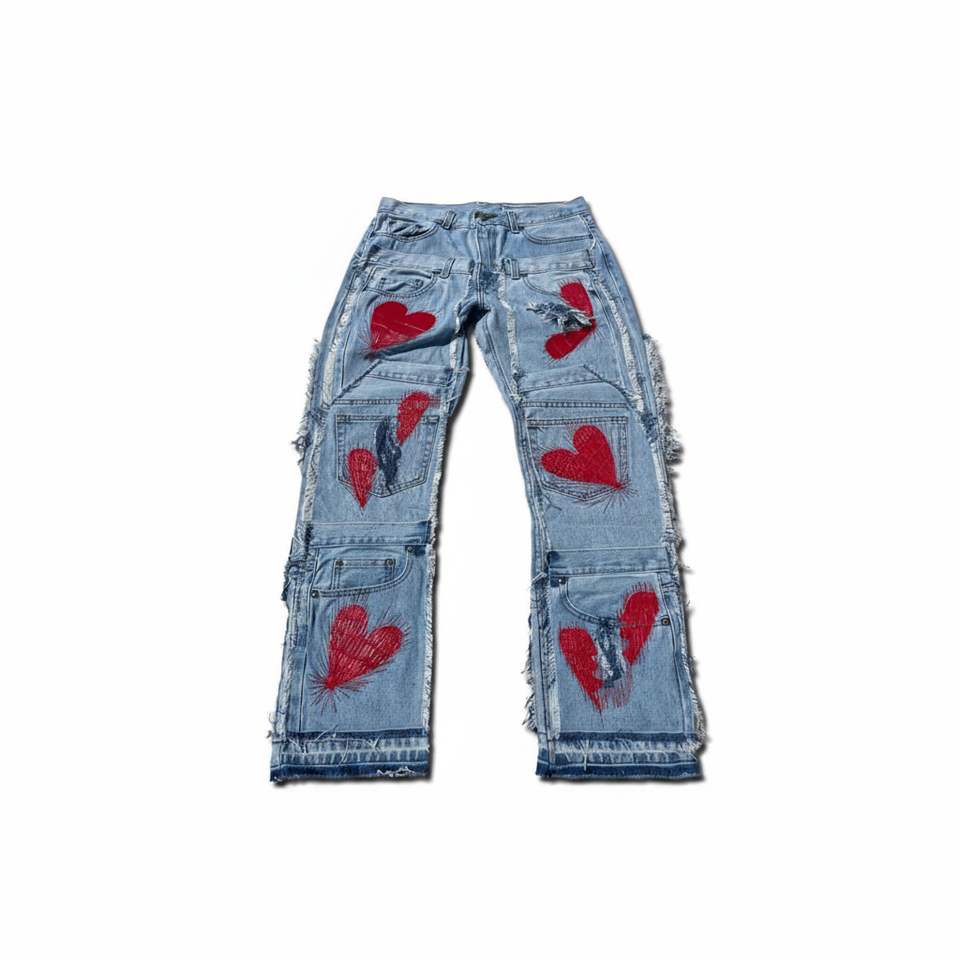 กางเกงเอวสูงทรงหลวมสไตล์สตรีทของผู้ชายกางเกงยีนส์แบบซ้อนกันมีรอยขาดทันสมัยดีไซน์ตามสั่งสไตล์สตรีท