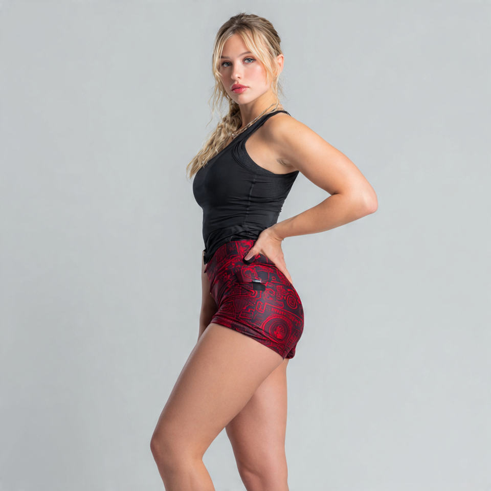 กางเกงขาสั้นโยคะเอวสูงกระชับสัดส่วนลายพิมพ์สำหรับผู้หญิง โพลีเอสเตอร์ 100% แห้งเร็ว ยกกระชับรูปร่าง กางเกงขาสั้นแบบซับลิเมชั่น ชุดบราสองชิ้น