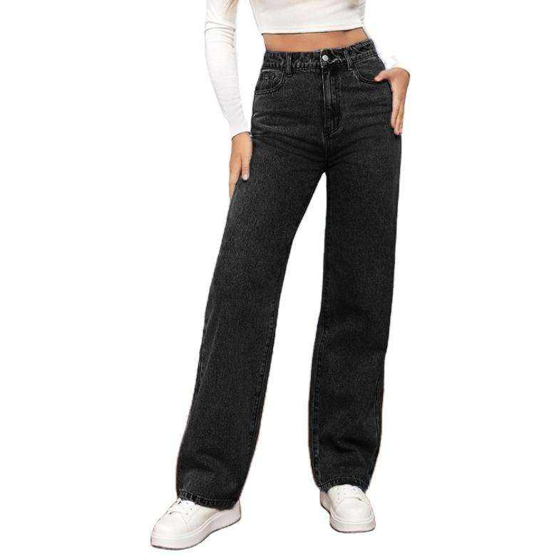 กางเกงยีนส์เอวสูงทรงขากว้างสีดำ กางเกงเดนิมทรงตรงสั่งตัดสำหรับผู้หญิง แฟชั่นลำลองสไตล์สตรีทแวร์ทรงหลวม