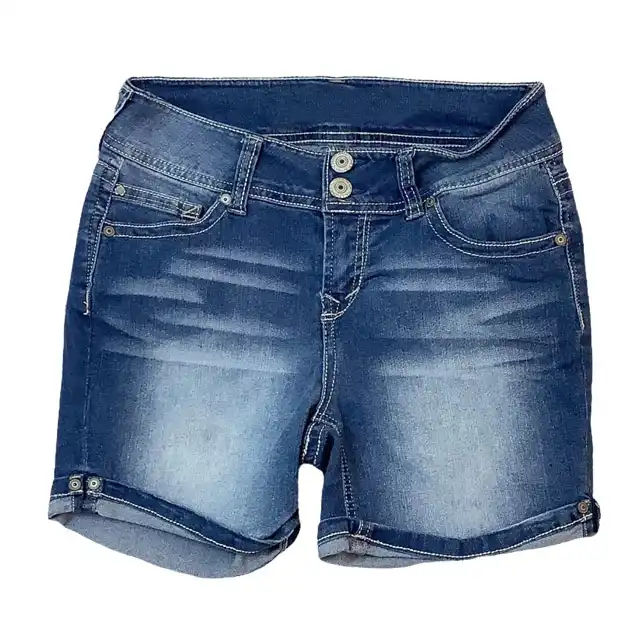 กางเกงยีนส์ขาสั้นเอวสูงสำหรับผู้หญิง แต่งกระดุม ทรงวินเทจ ฟอกสี ขาดรุ่ย ขอบดิบ ปลายขาพับได้ เหมาะสำหรับฤดูร้อน