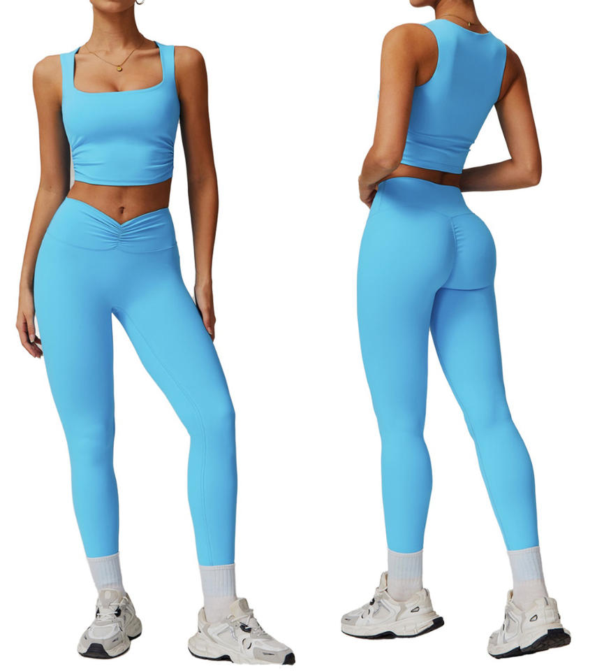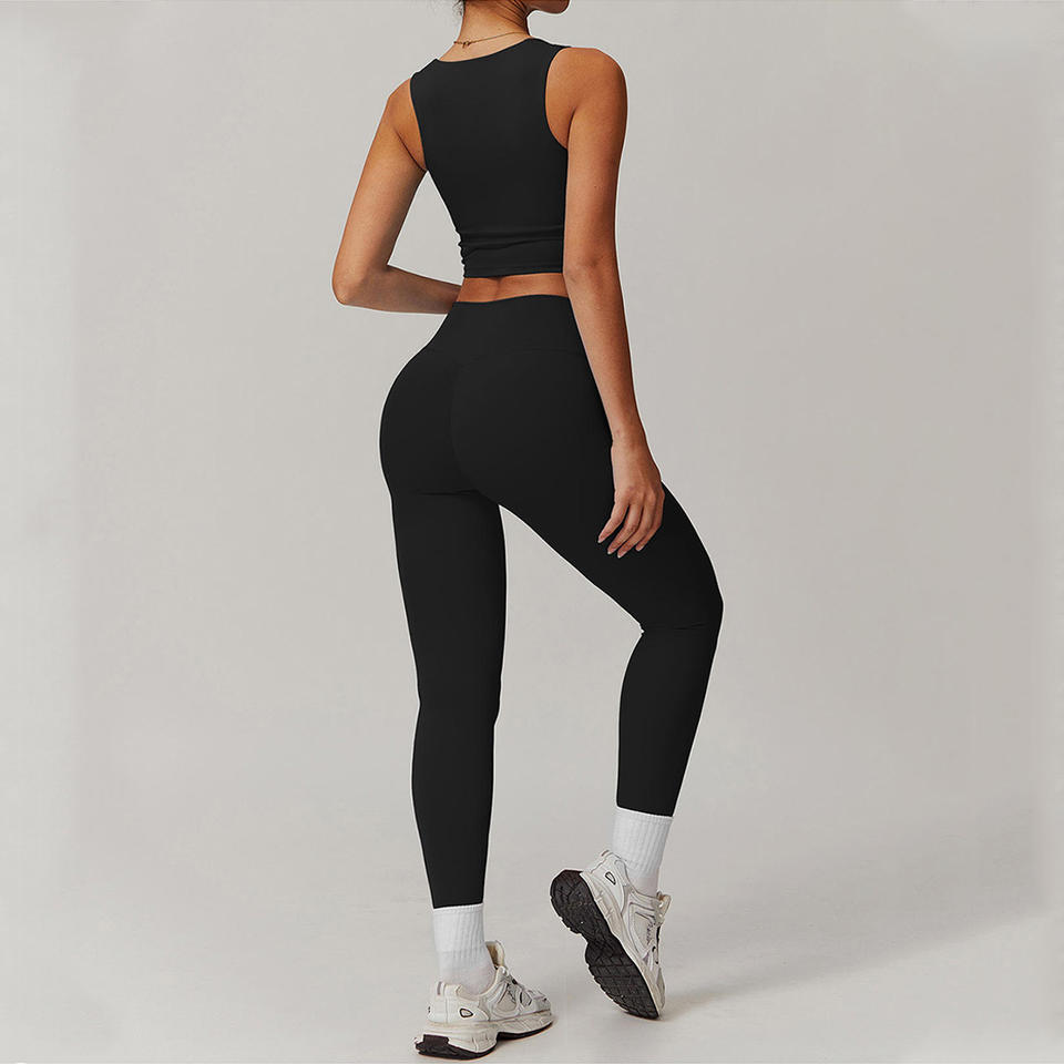 กางเกงโยคะเอวสูงผู้หญิง สไตล์เรียบง่าย ผ้าสแปนเด็กซ์ ยืดหยุ่น ชุดออกกำลังกายขายส่ง OEM เสื้อชั้นในแบบสายเดี่ยว ชุดฟิตเนส 2 ชิ้น