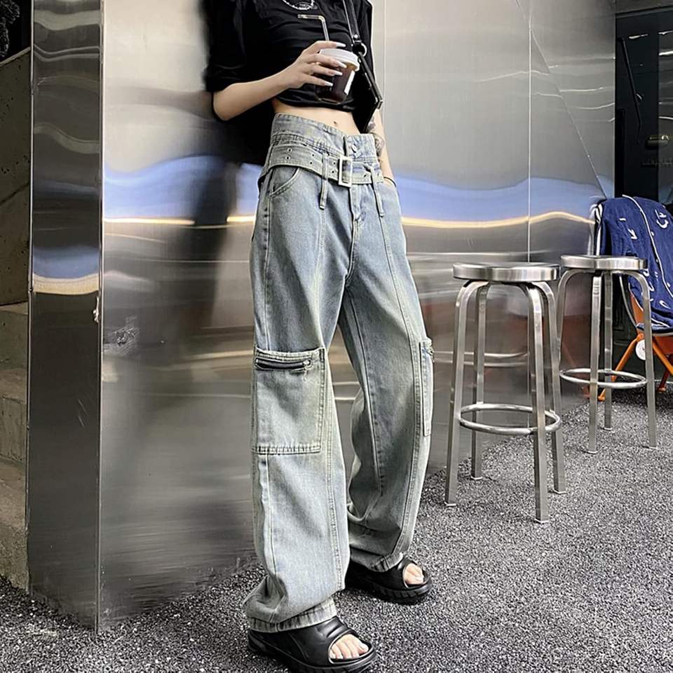 กางเกงยีนส์คาร์โก้เอวสูงน่ารักสำหรับวัยรุ่นสาวๆมีกระเป๋าแบบฝาพับใส่สบายกางเกงยีนส์ขากว้างเข็มขัดระบายอากาศได้ดี